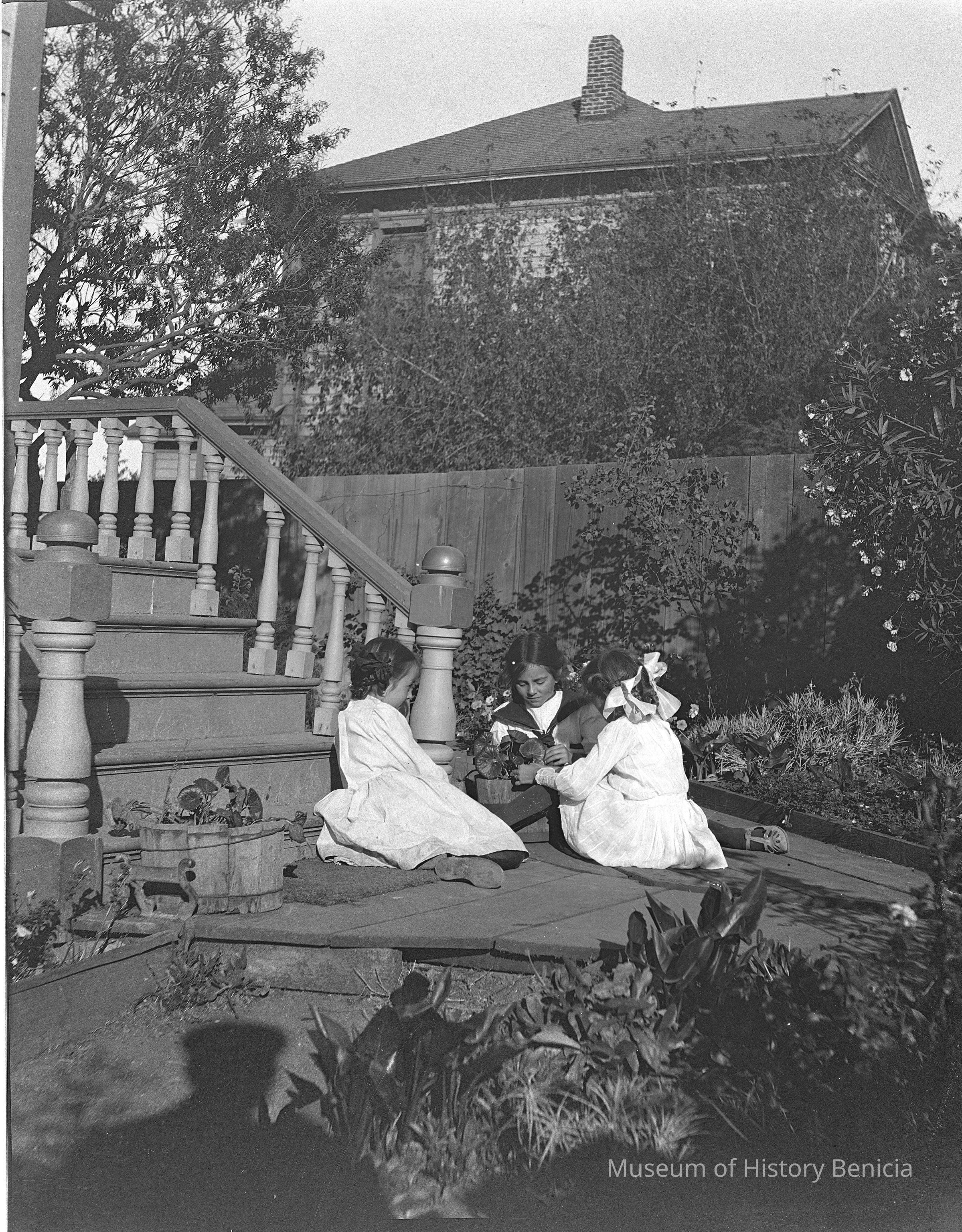 Same three girls as in 2004.001.0399, playing at the foot of the stairs. Girl with big bow looks like Margurite Molfino.