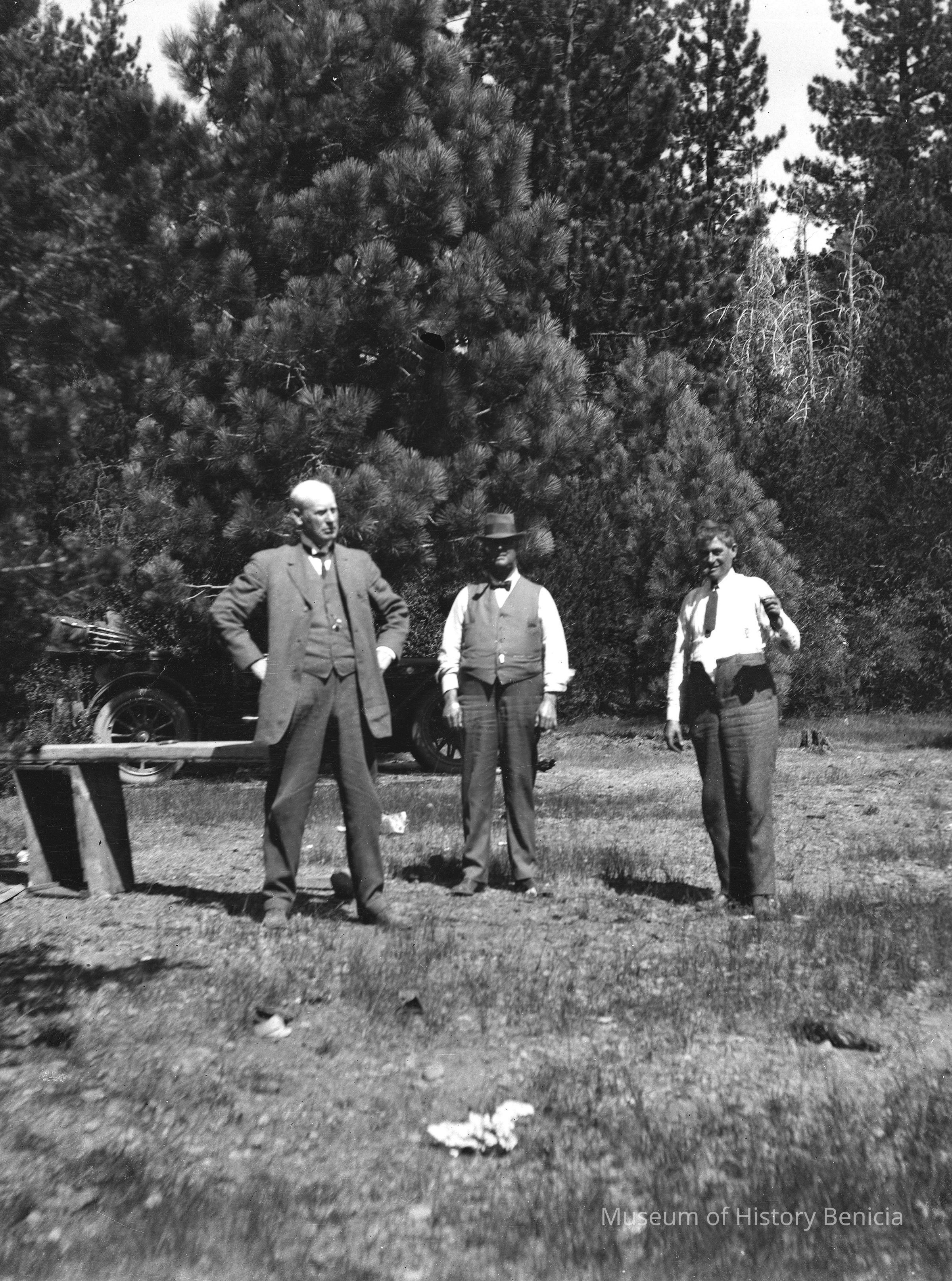 Three men standing in a wooded area. This looks like part of the same group that is seen in the road trip photos. The man on the left may be Mayor Crooks.Collection