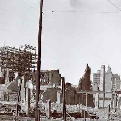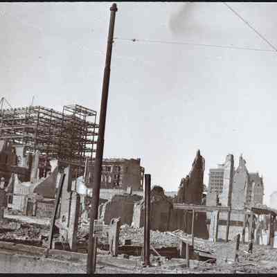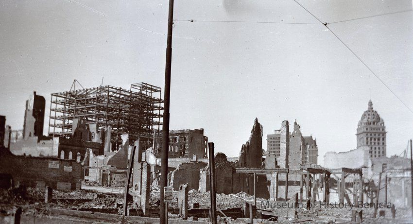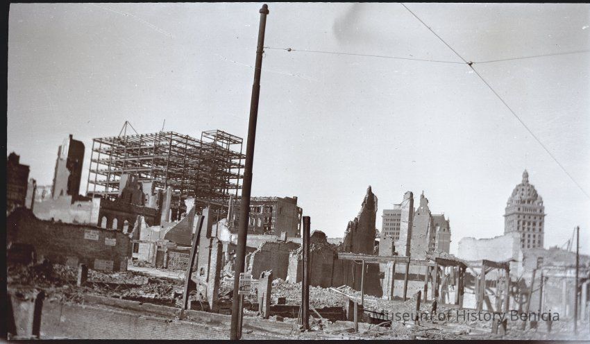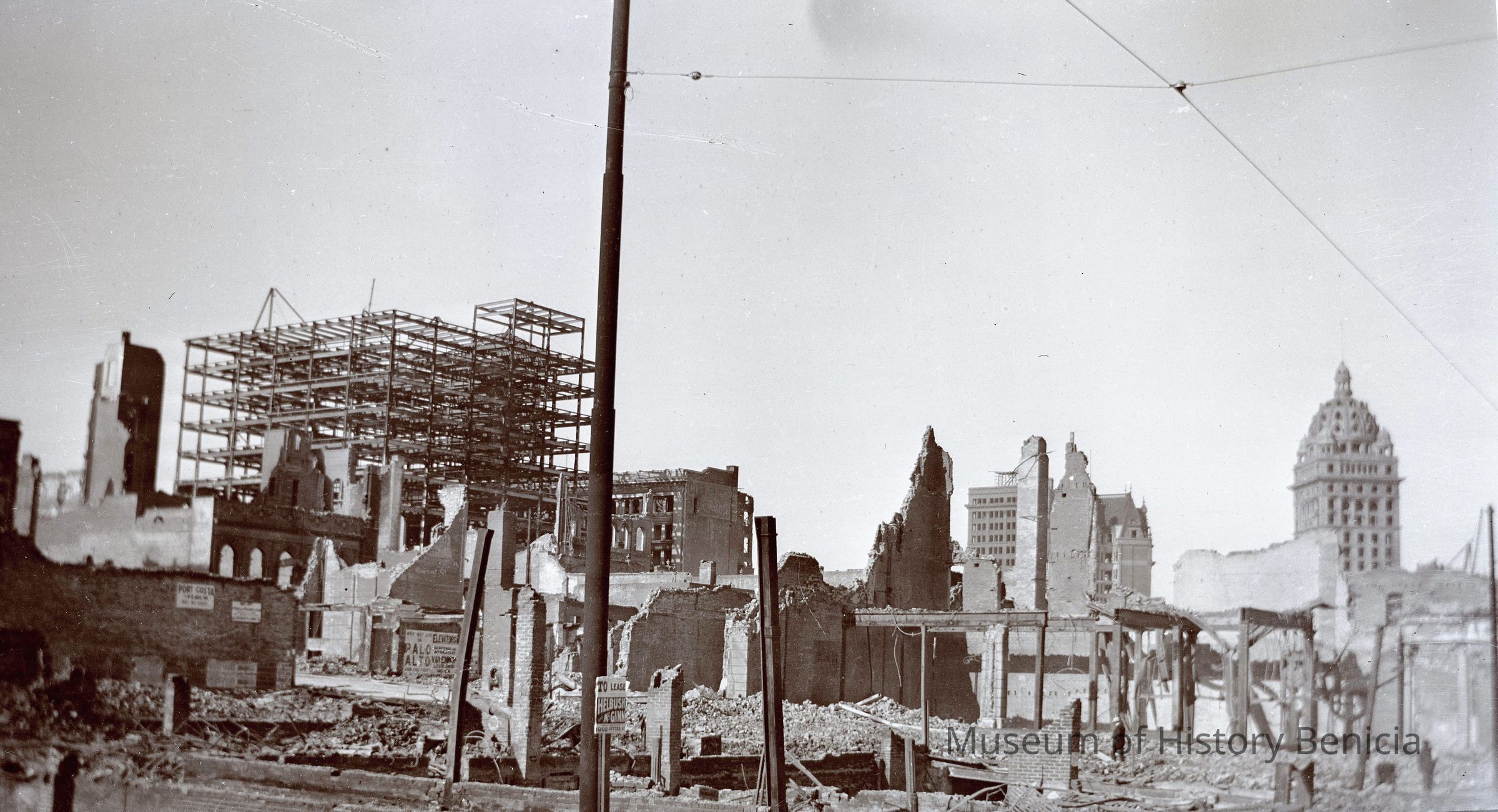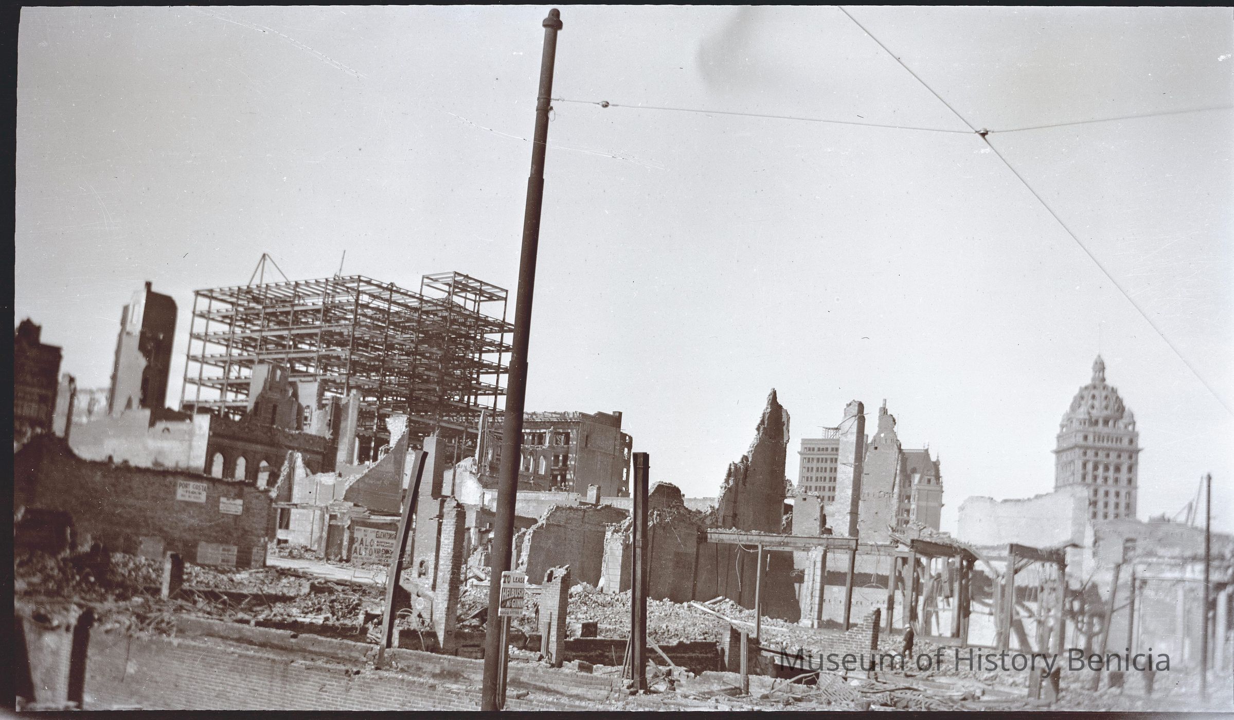This photo is one of a series of photos of San Francisco after the 1906 earthquake. It shows the start of the city rebuilding. There are signs for leasing by Helbush McGinn?? on Sutter street, a Palo Alto elevator company and even a company in Port Costa. The Call building can be seen in the distance.Collection