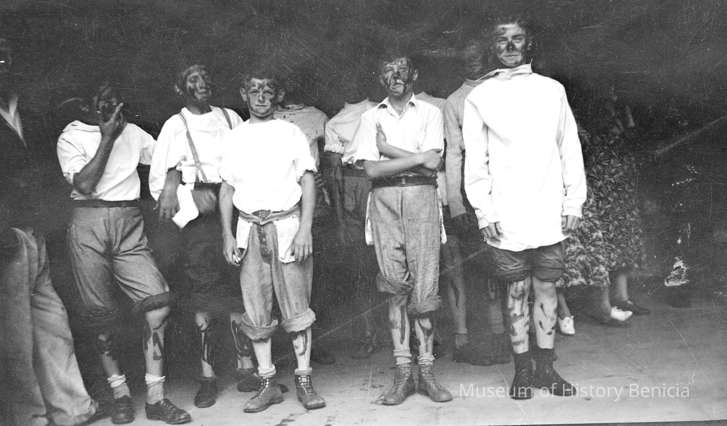 B/W negative - group of young men (possibly 9) with 5 being prominent in front; it appears they may be dressed similarly, perhaps after an athletic contest
