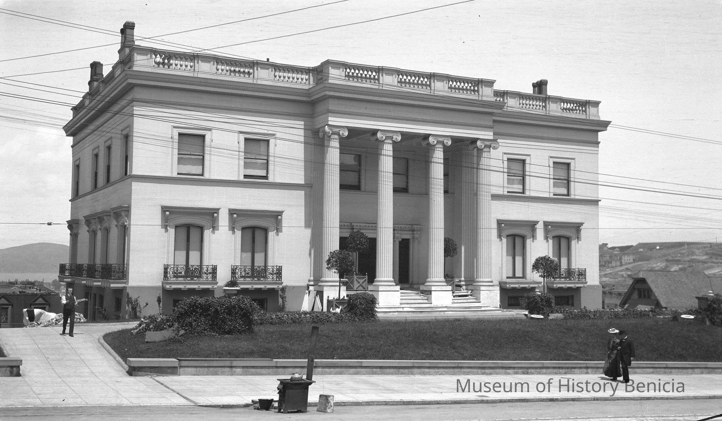 Street scene, San Francisco the earthquake in 1906. 1906 SF earthquake street scenes. Couple walking in front of a mansion.