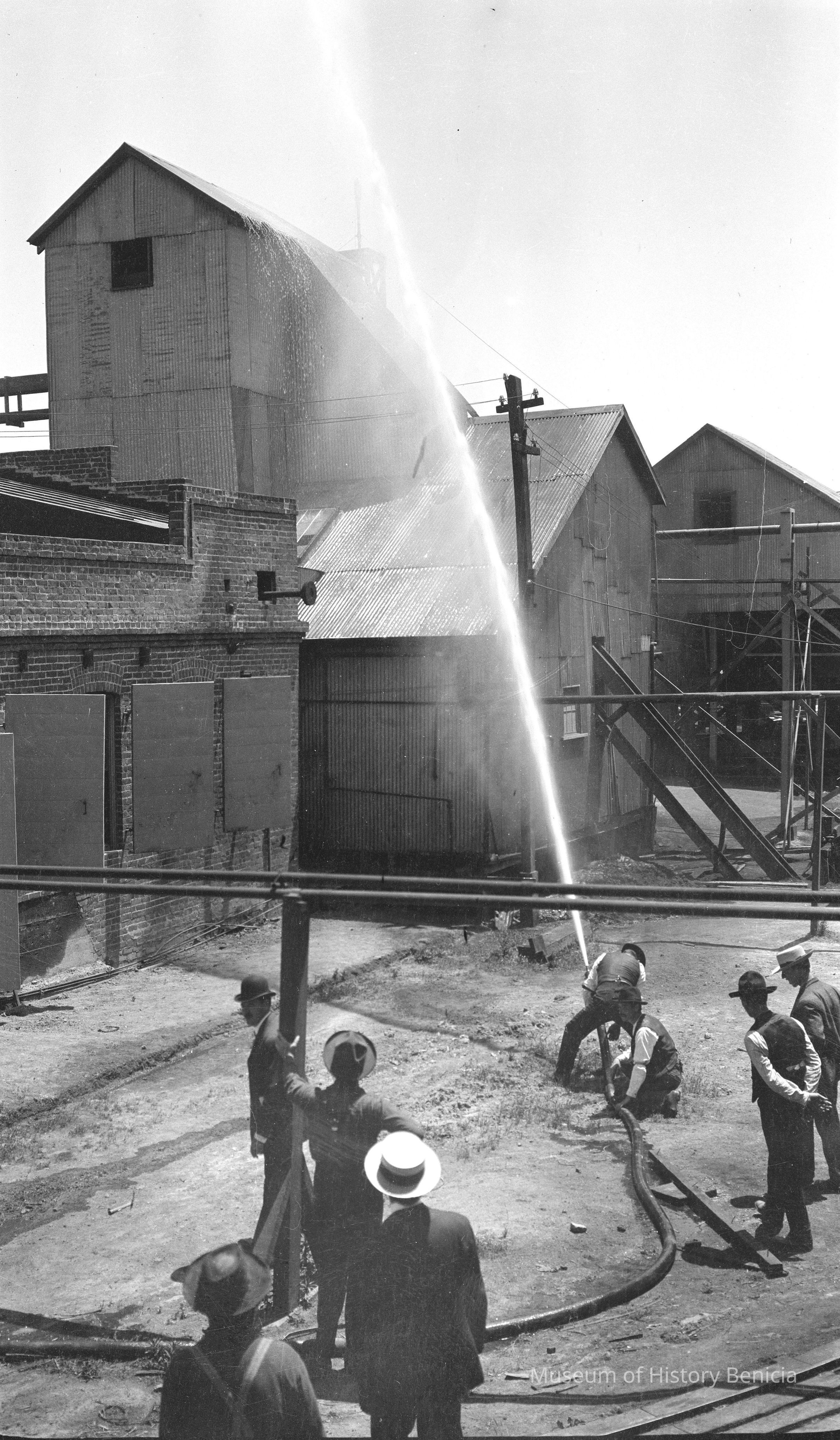 Benicia Fire Department Drill July 1906. Using firehoses at the Benicia Tannery buildings.