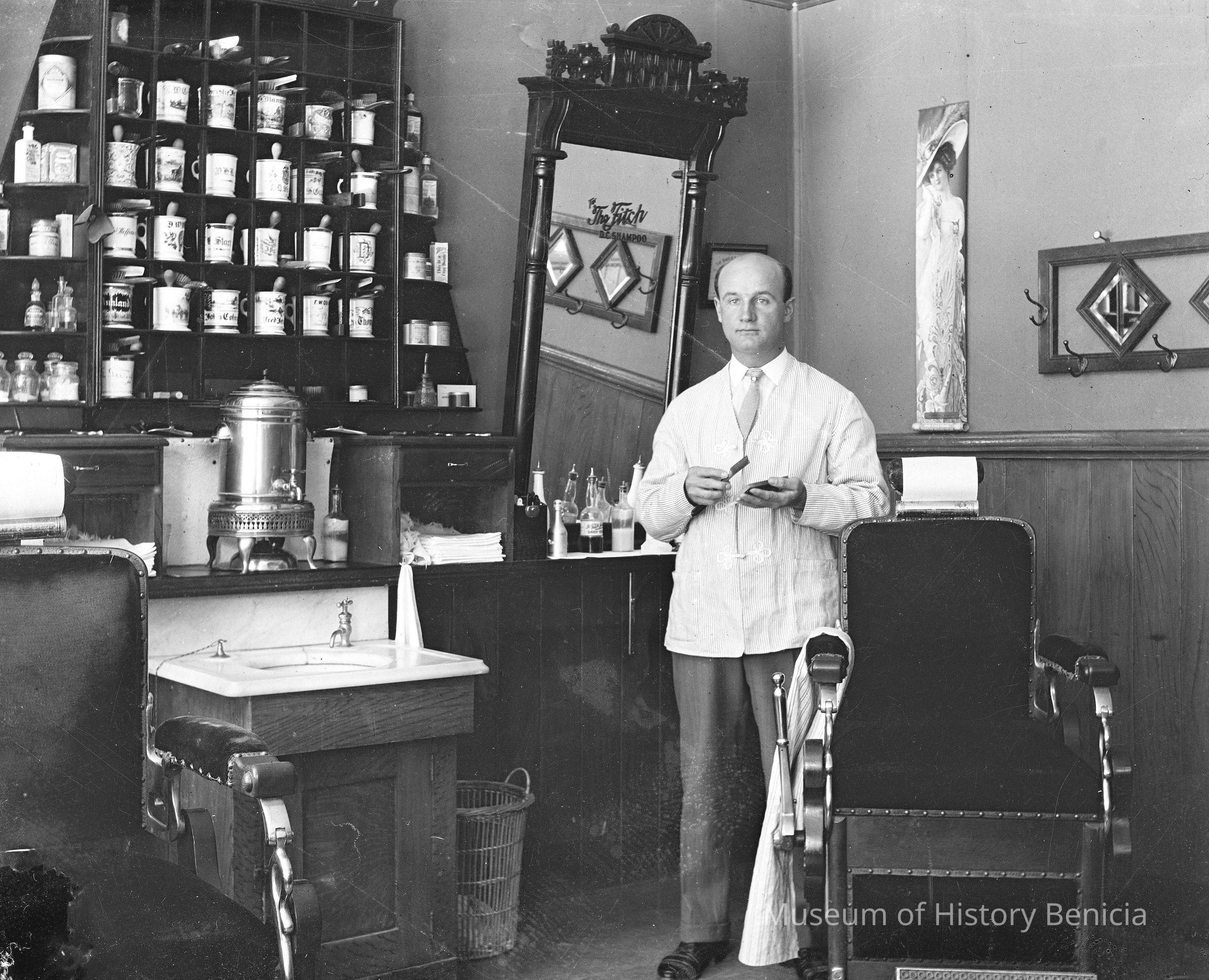 A man standing in a Barber Shop (John Molfino?). There is another picture (04.01.446) in the same shop with Molfino. This must be his shop even though it is slightly different than the shop in 04.01.0015.Collection