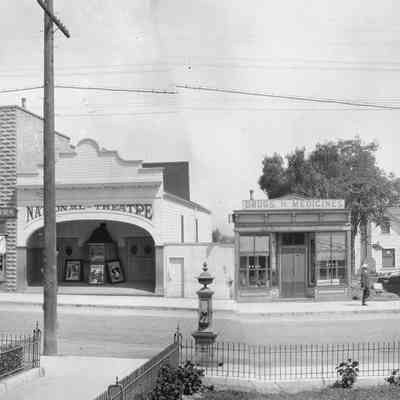 *Majestic Theatre not yet built. View of the National theater and Quinn's store from across the street at the capitol. Newspaper says the National theater was to be renamed the Orpheum in 01/1915. This photo must be prior to 1915.