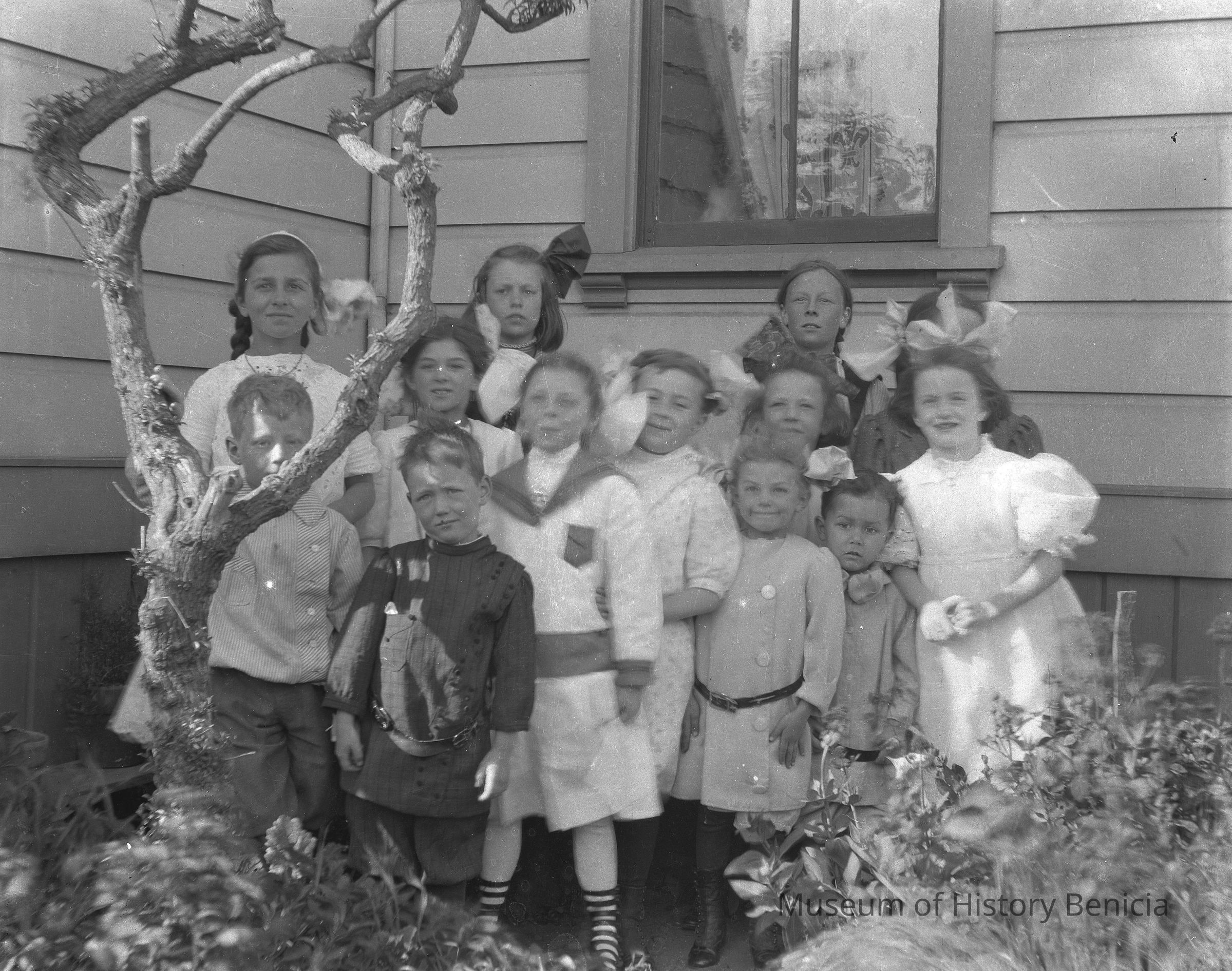 A group of boys and girls beside a tree. Group of kids outside a house. Includes Margurite (about age 9) and Violet (about age 5).