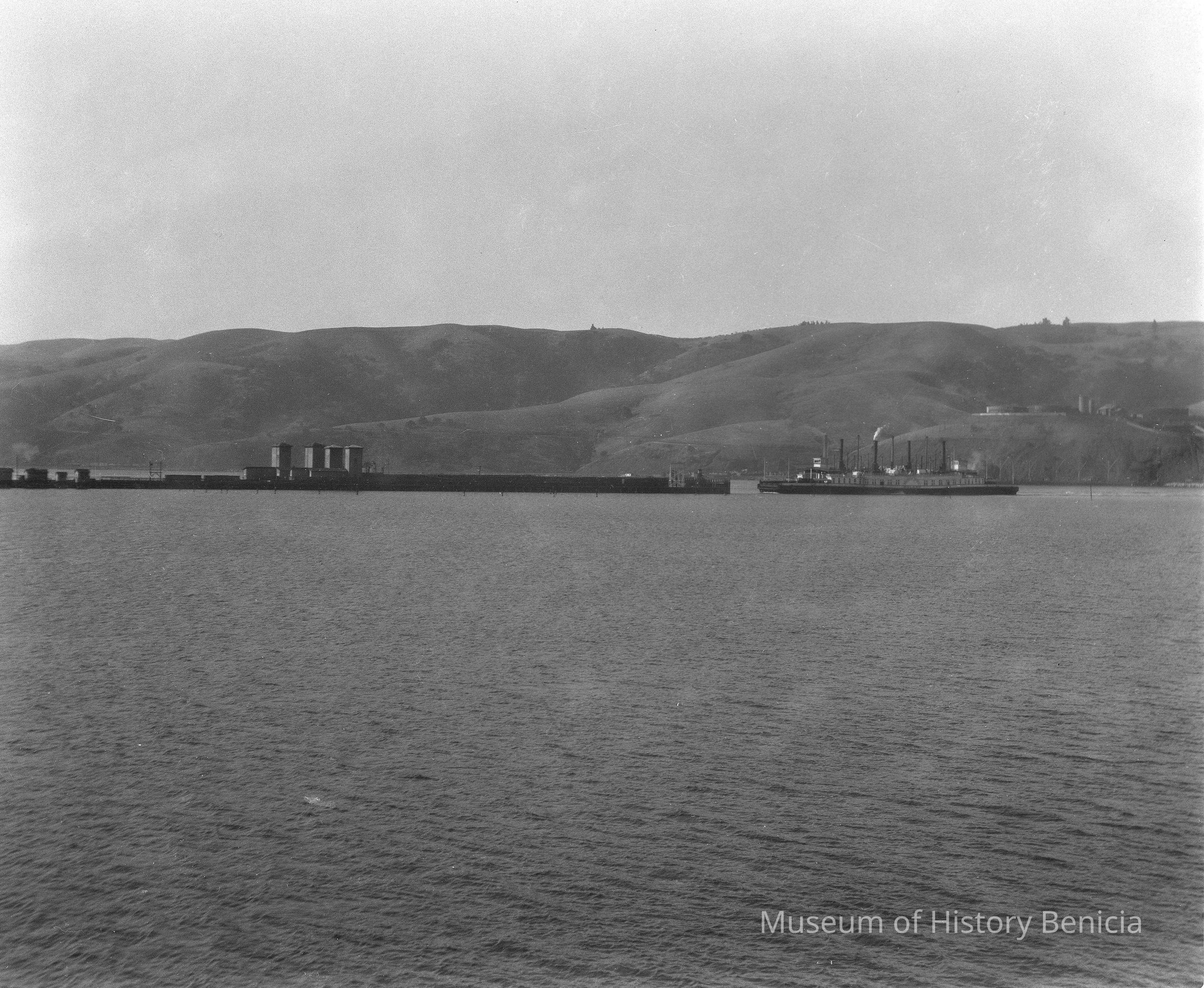A scene of water and hills with a boat in the distance. View of Carquinez Strait and First Street pier. Ferry boat Solano docking..