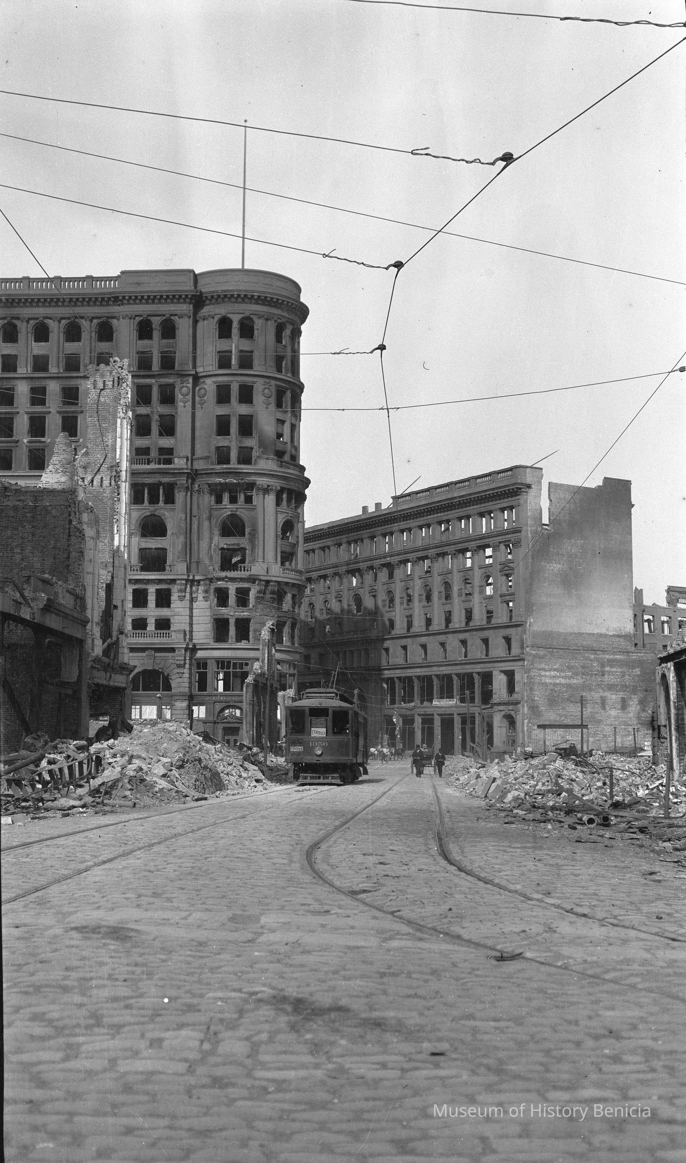 Street scene, San Francisco the earthquake in 1906. 1906 SF earthquake street scenes. Street car and tracks winding through destroyed buildings. Sign on trolley says 12th and Fulton st Ferries. Sign on building next to street car says "The Western Nation".Collection