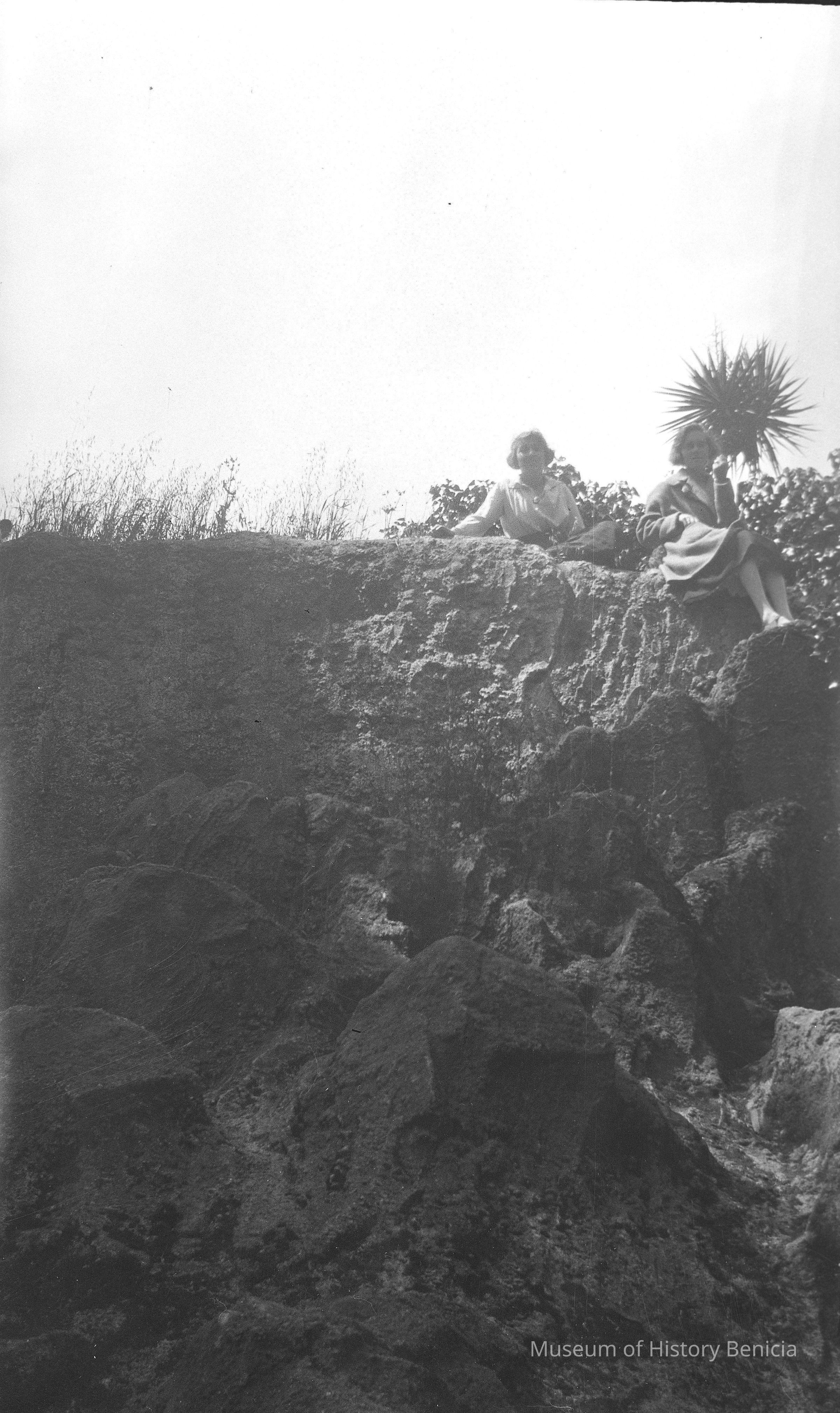 Two women sitting on rocks surrounded by tall grass. Two Women sitting in the rocks. One is making a fist and may be showing her ring.
