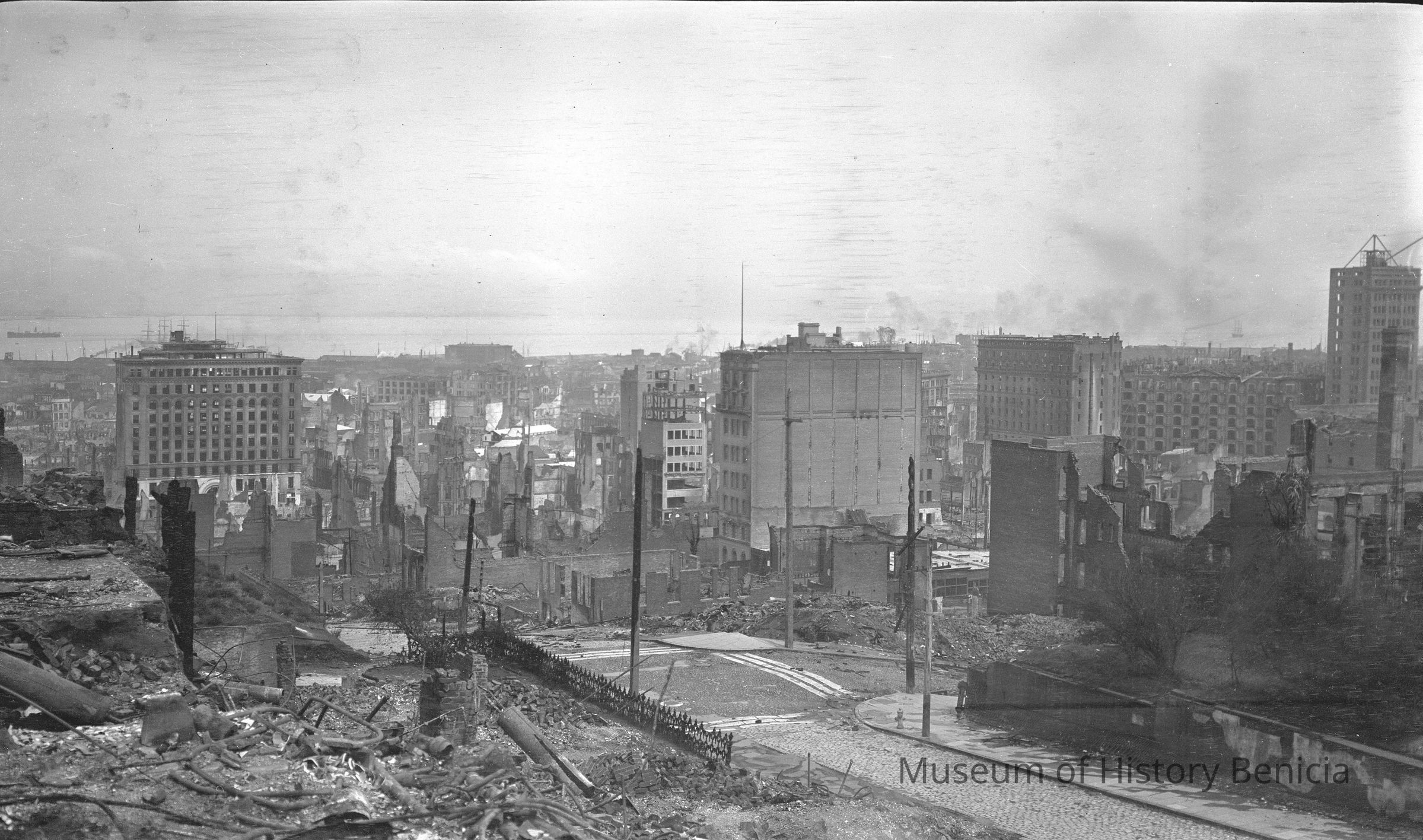Street scene, San Francisco the earthquake in 1906. 1906 SF earthquake street scenes. View from a hill out towards the Bay.
