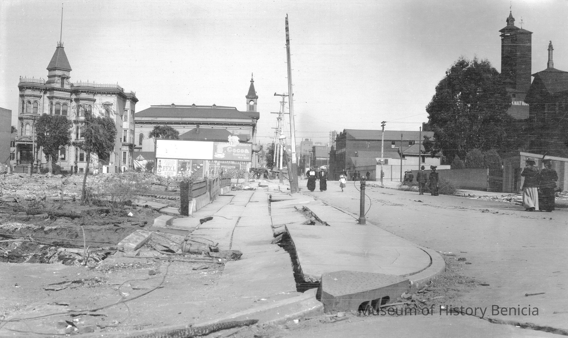 Street scene, San Francisco the earthquake in 1906. 1906 SF earthquake street scenes. People walking on the street with an empty lot and houses, billboards, churches, etc in background.Collection