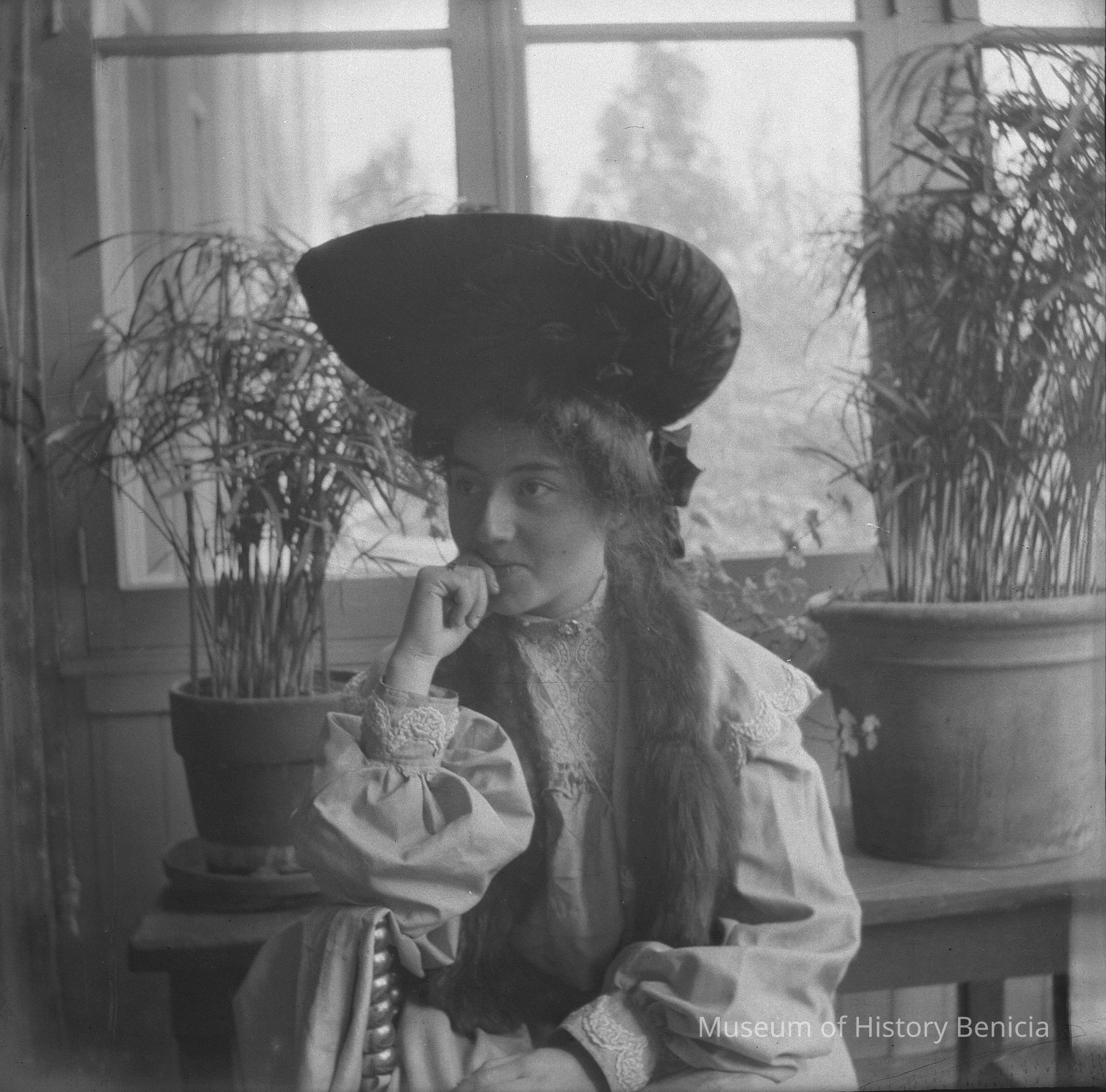 A woman sitting on a couch. Negative book says Madeline - Emily - Philip