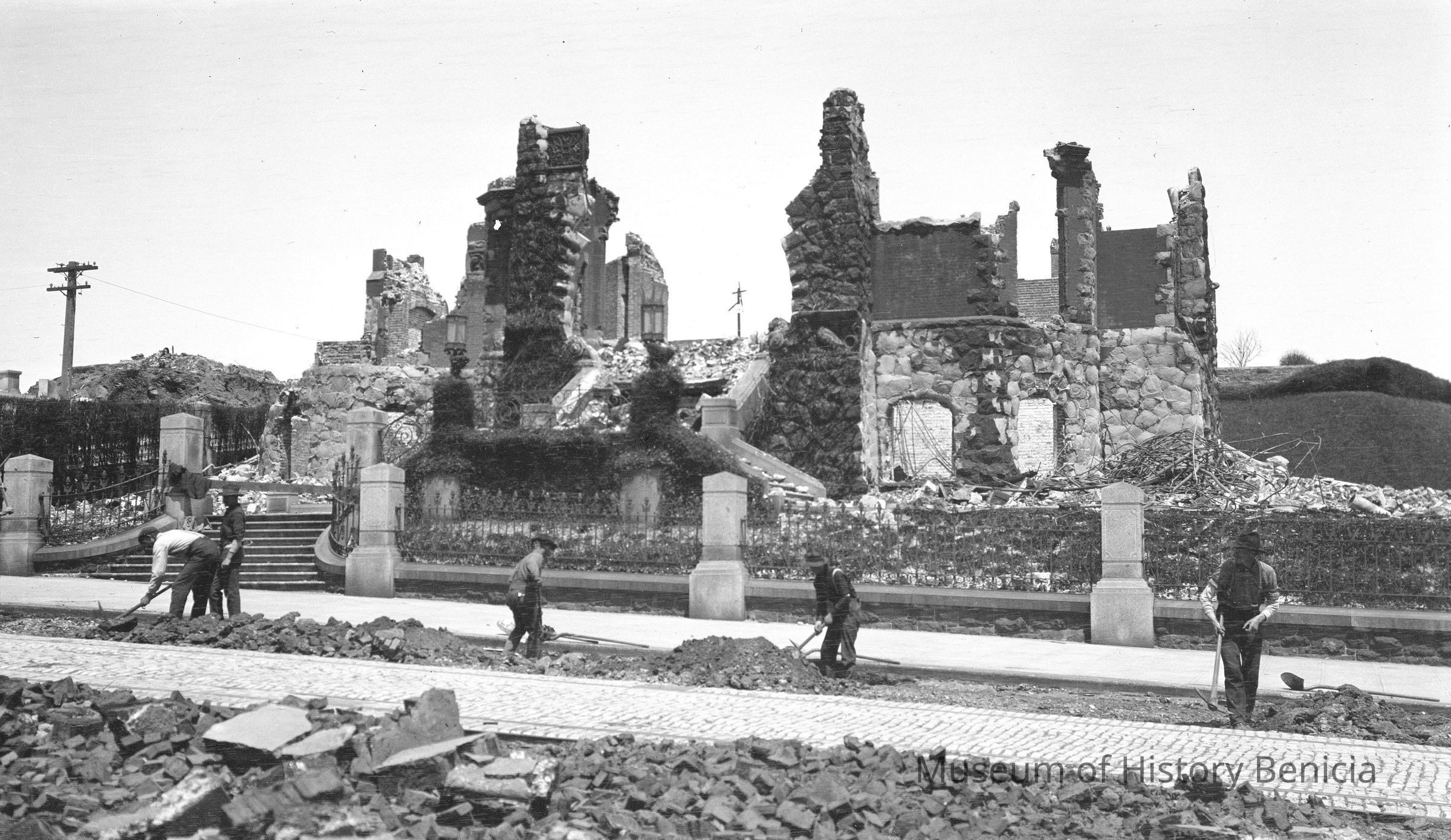 San Francisco, 1906. View of destroyed buildings from the earthquake and fire. 1906 San Francisco earthquake. Hall of Justice and other wrecks. Digging out the rubble in front of stone mansion with a wrought iron fence.
