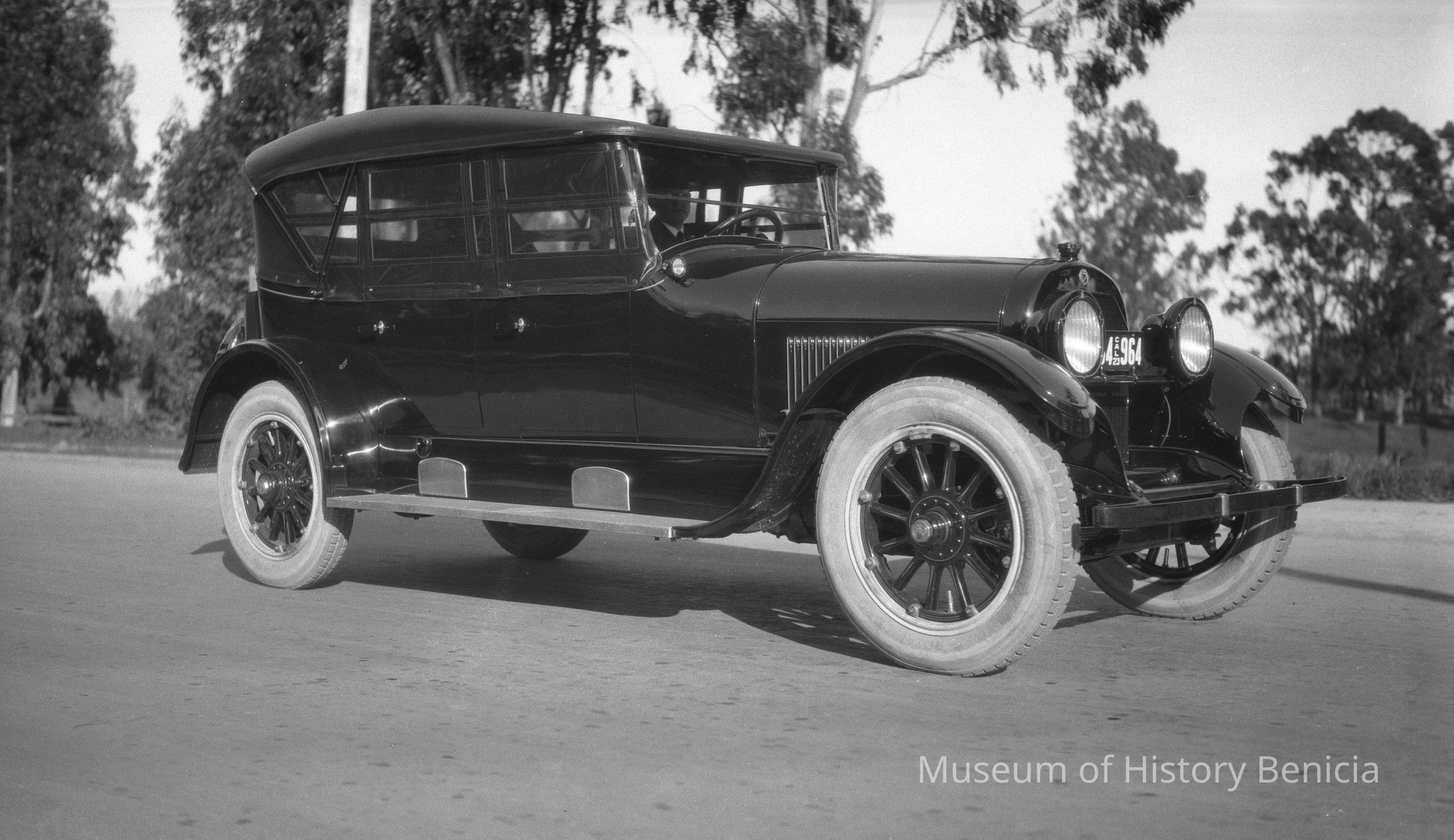 An automobile. Photo of a car and driver. License number 4964 "Cal 23".