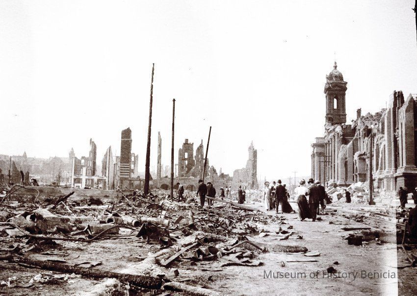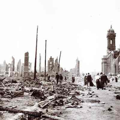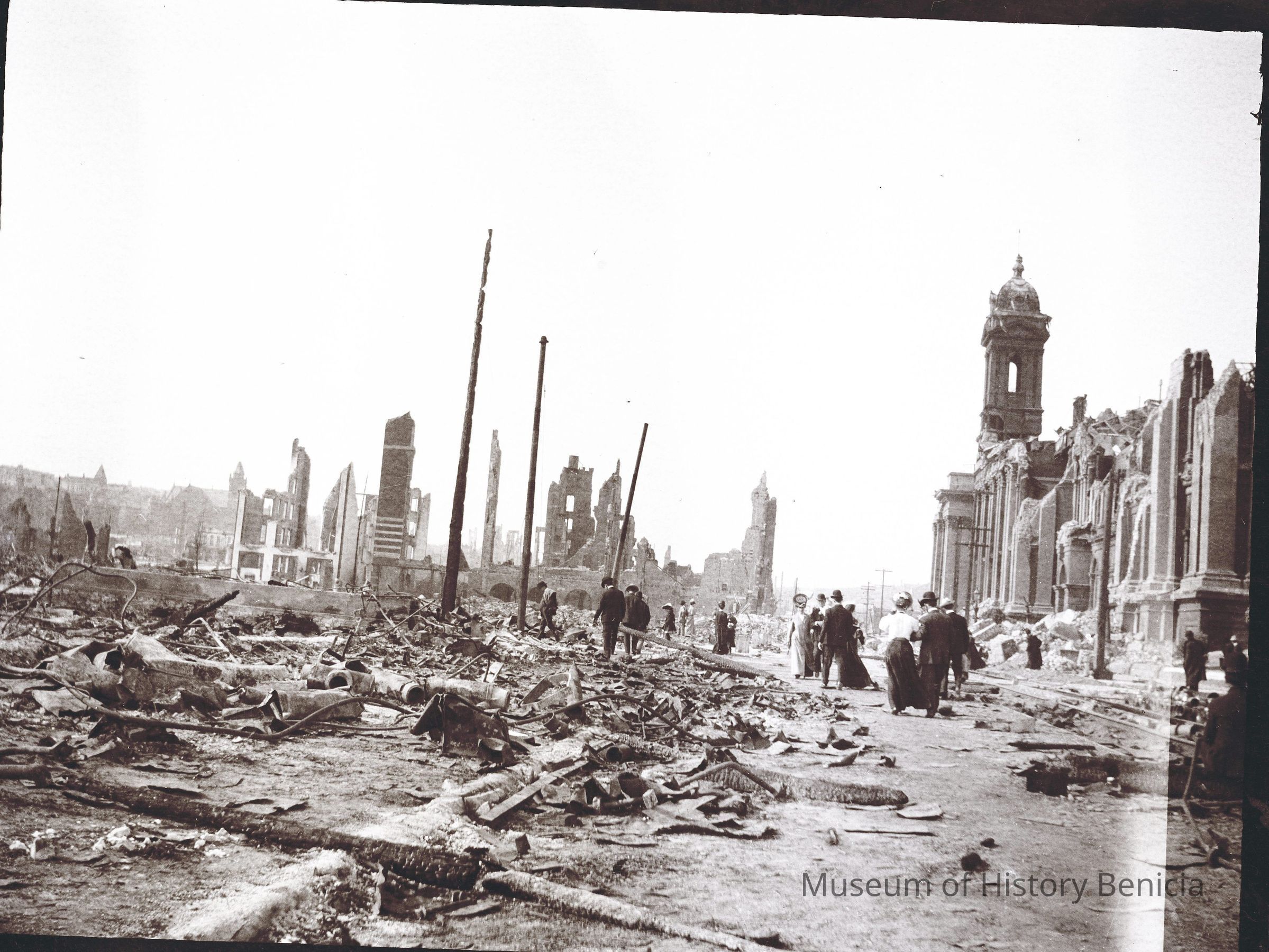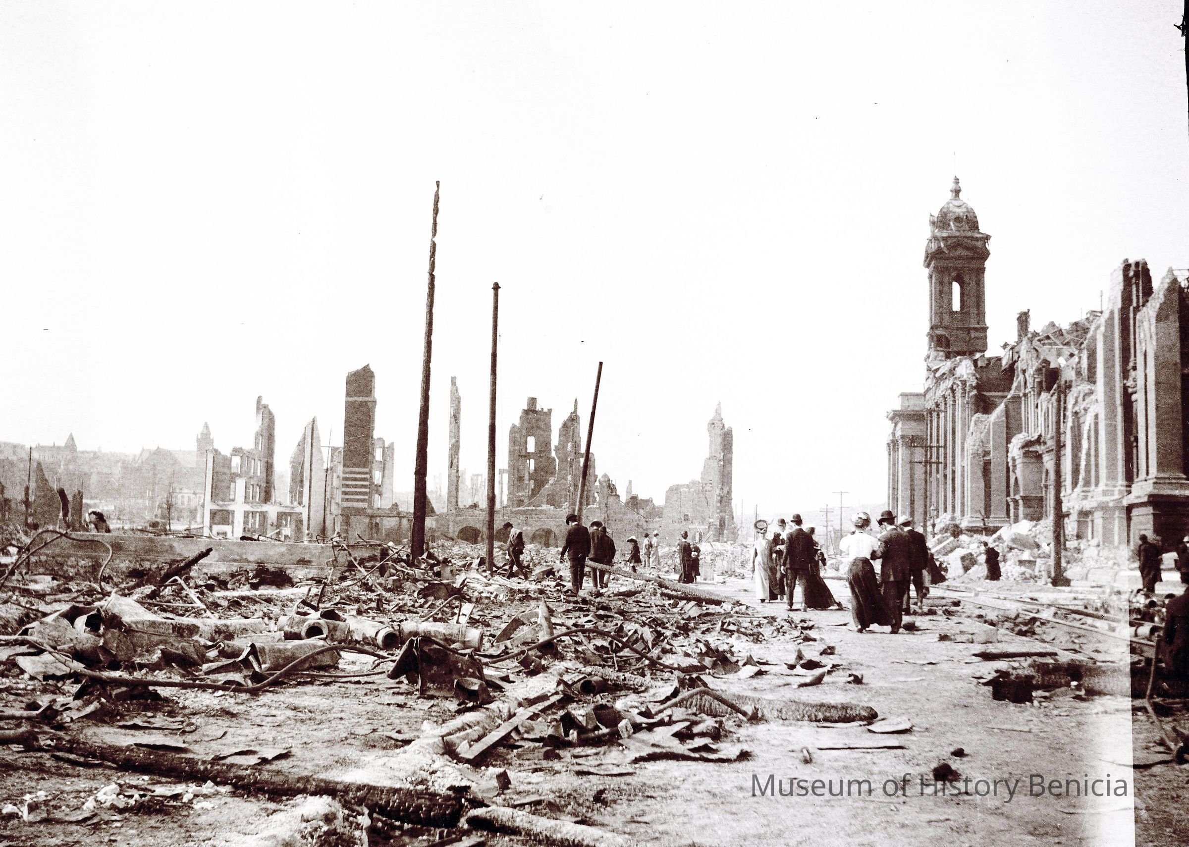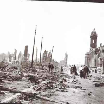This photo is one of a series of photos of San Francisco after the 1906 earthquake. This photo shows a bunch of people walking around the rubble. They are looking down to avoid tripping or maybe to find anything of value.Collection