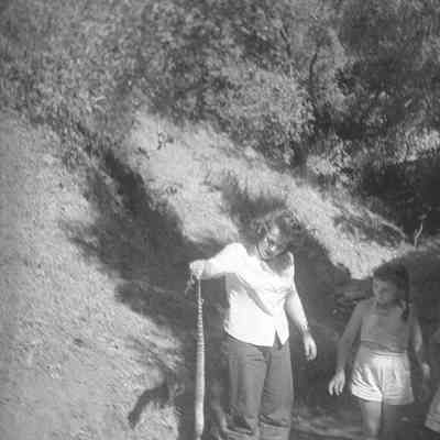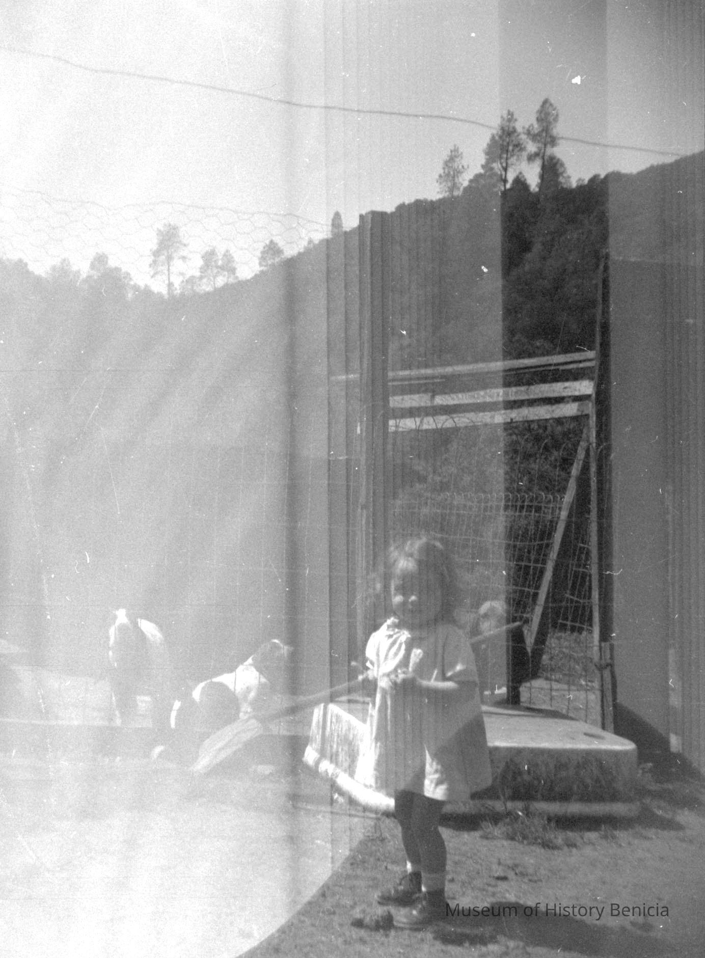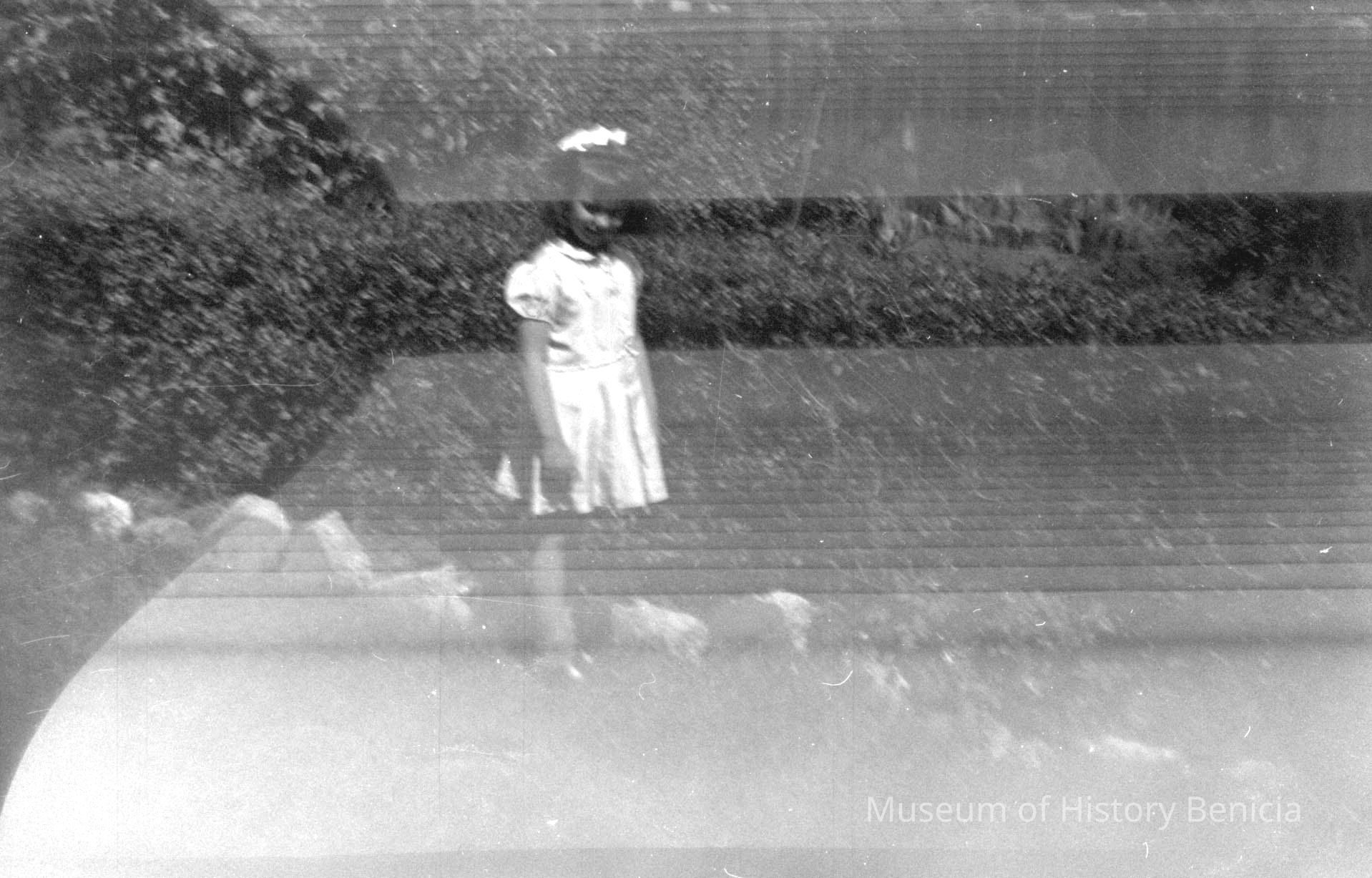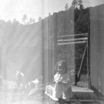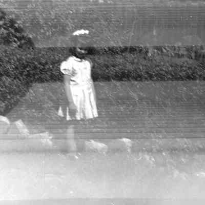 Negative strip: B/W negatives double exposure - overlapping images, possibly a young girl standing in a field and a youg girl sitting on stairs (?)