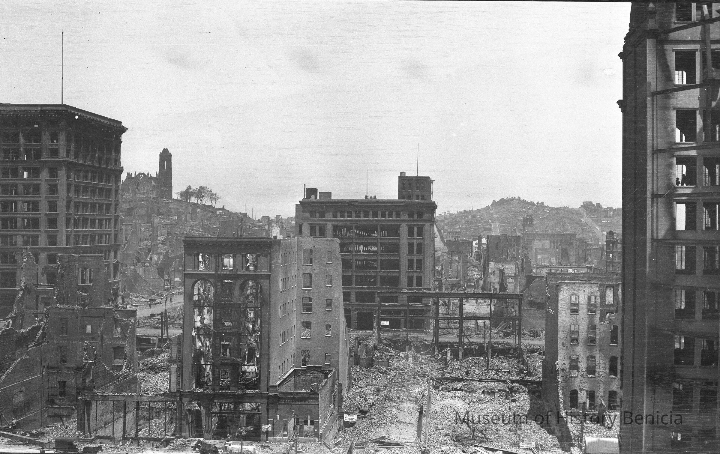 San Francisco, 1906. View of the city's destruction taken from the Kohl (?) building. 1906 SF earthquake. Views from Kamm building (701 Market St).. Two hills in the distance, one with a destroyed church on it.Collection