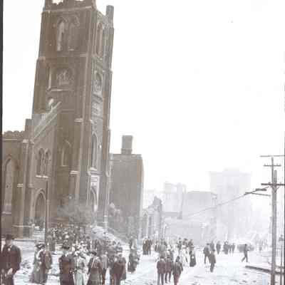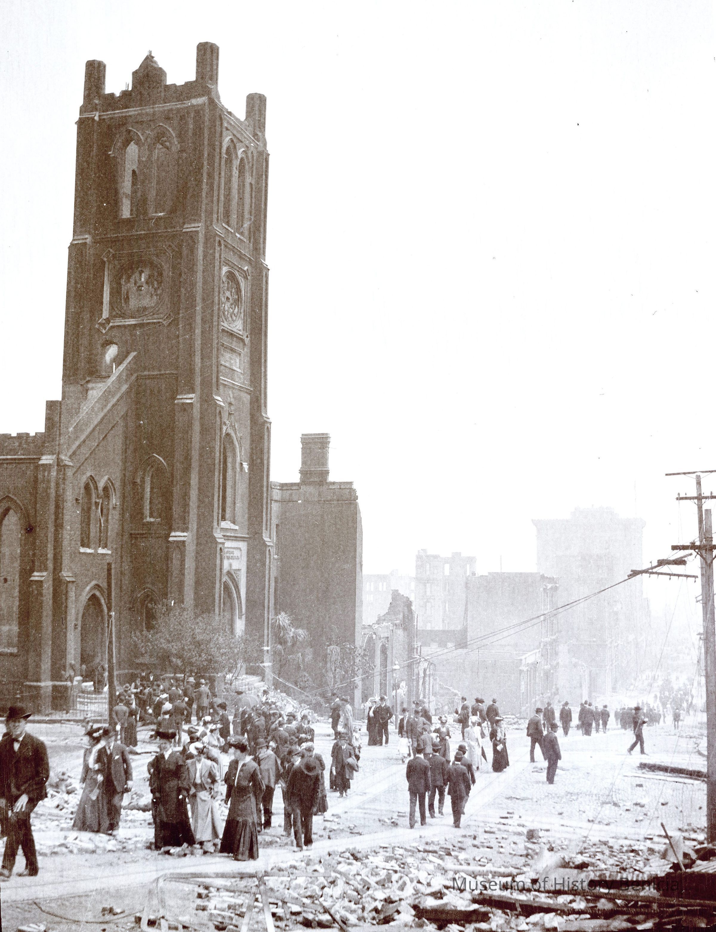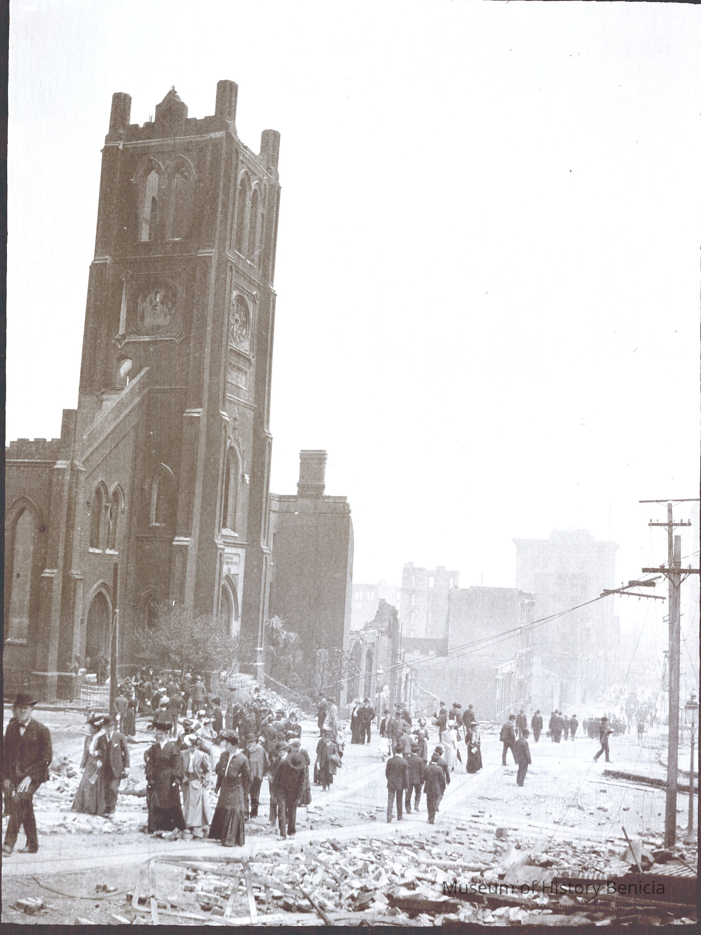 This photo is one of a series of photos of San Francisco after the 1906 earthquake. This photo shows people walkin by St. Mary's church at 660 California Street.