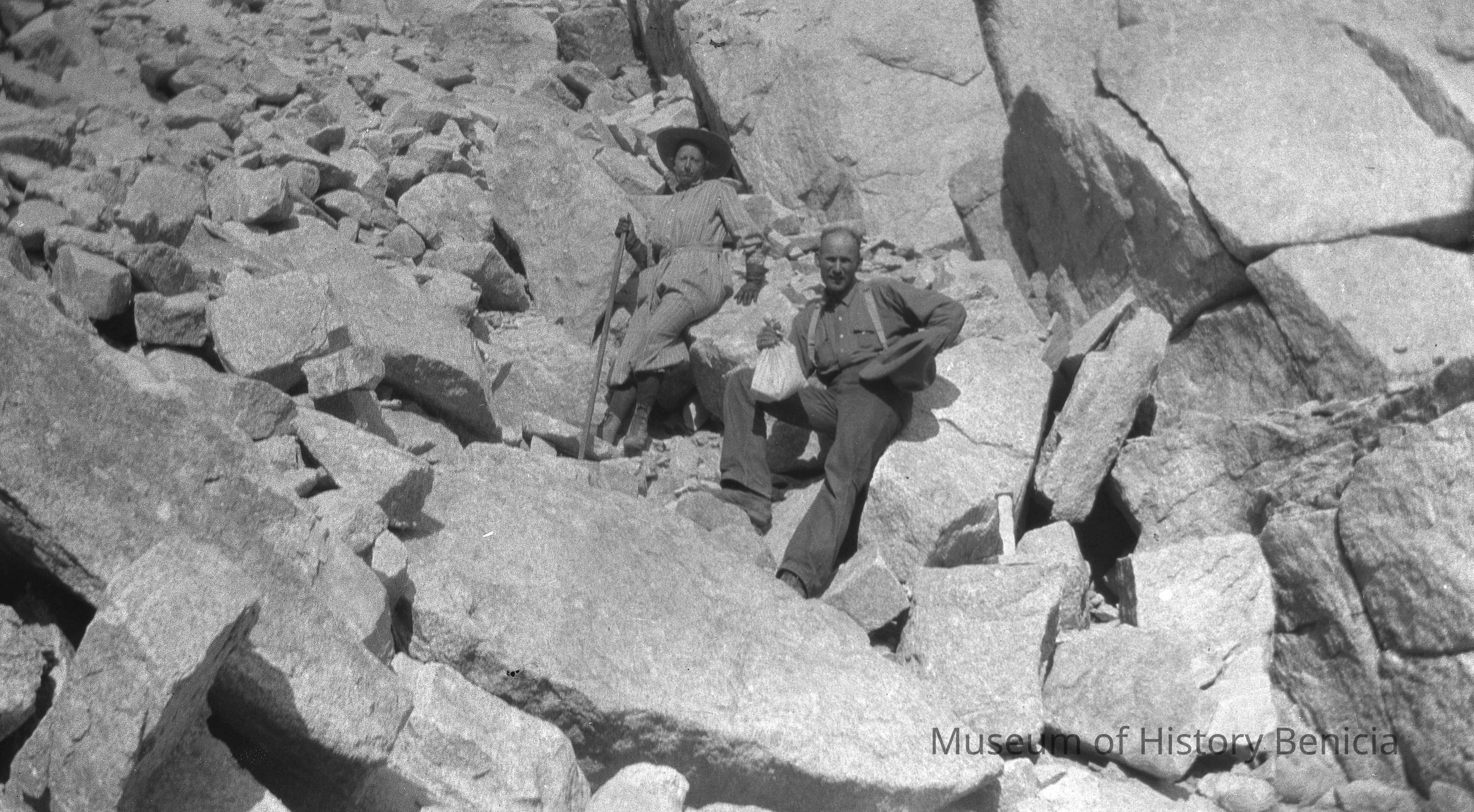Two men standing in a rocky area. Man and woman sitting on rocks on the side of the hill. He has a bag of food and she has a walking stick.