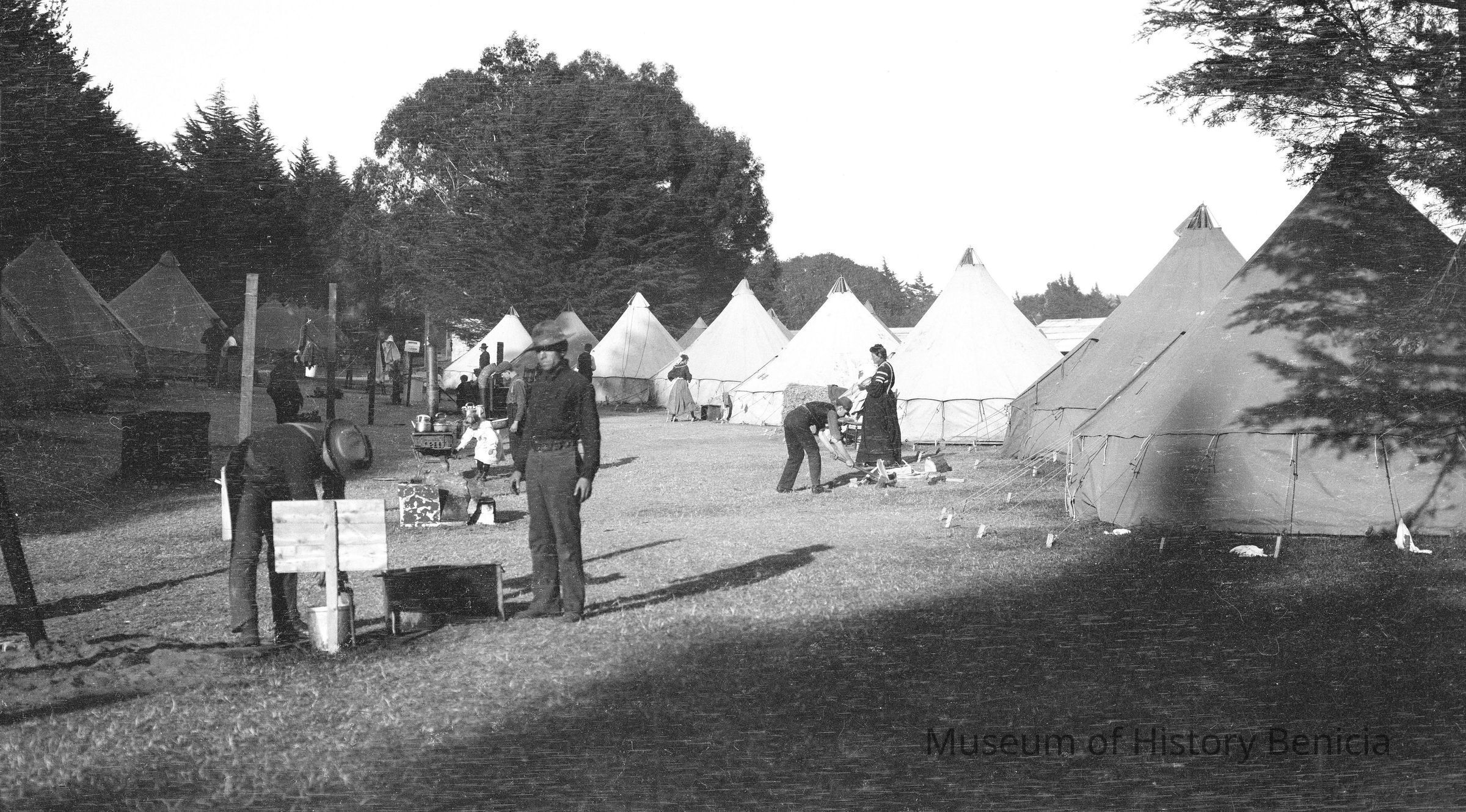 Refugee camp, San Francisco. 1906 SF earthquake refugee camps. People chopping wood and cooking in camp.