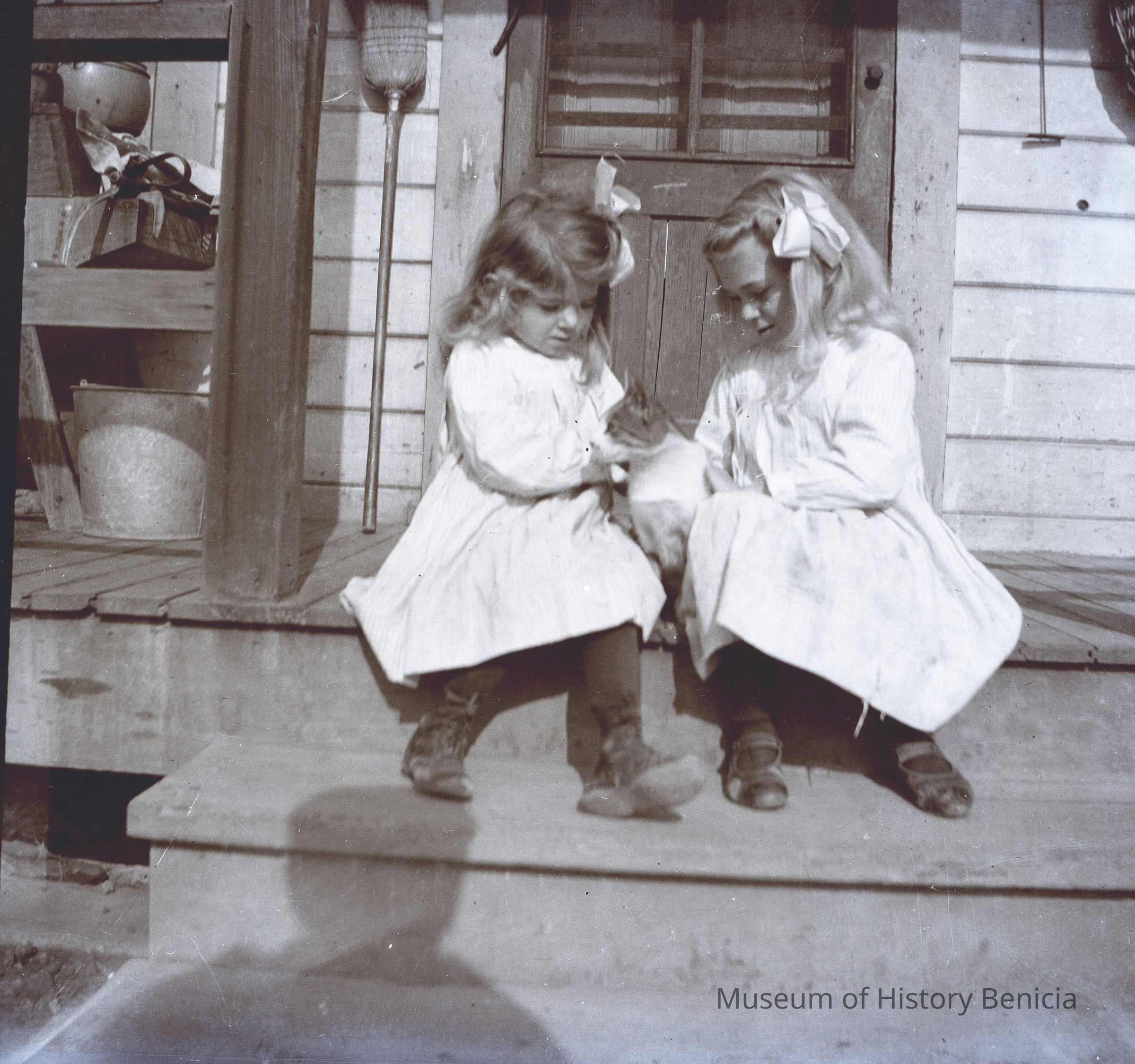This negative shows John's two daughters (Margurite and Violet) playing with their cat on the steps.