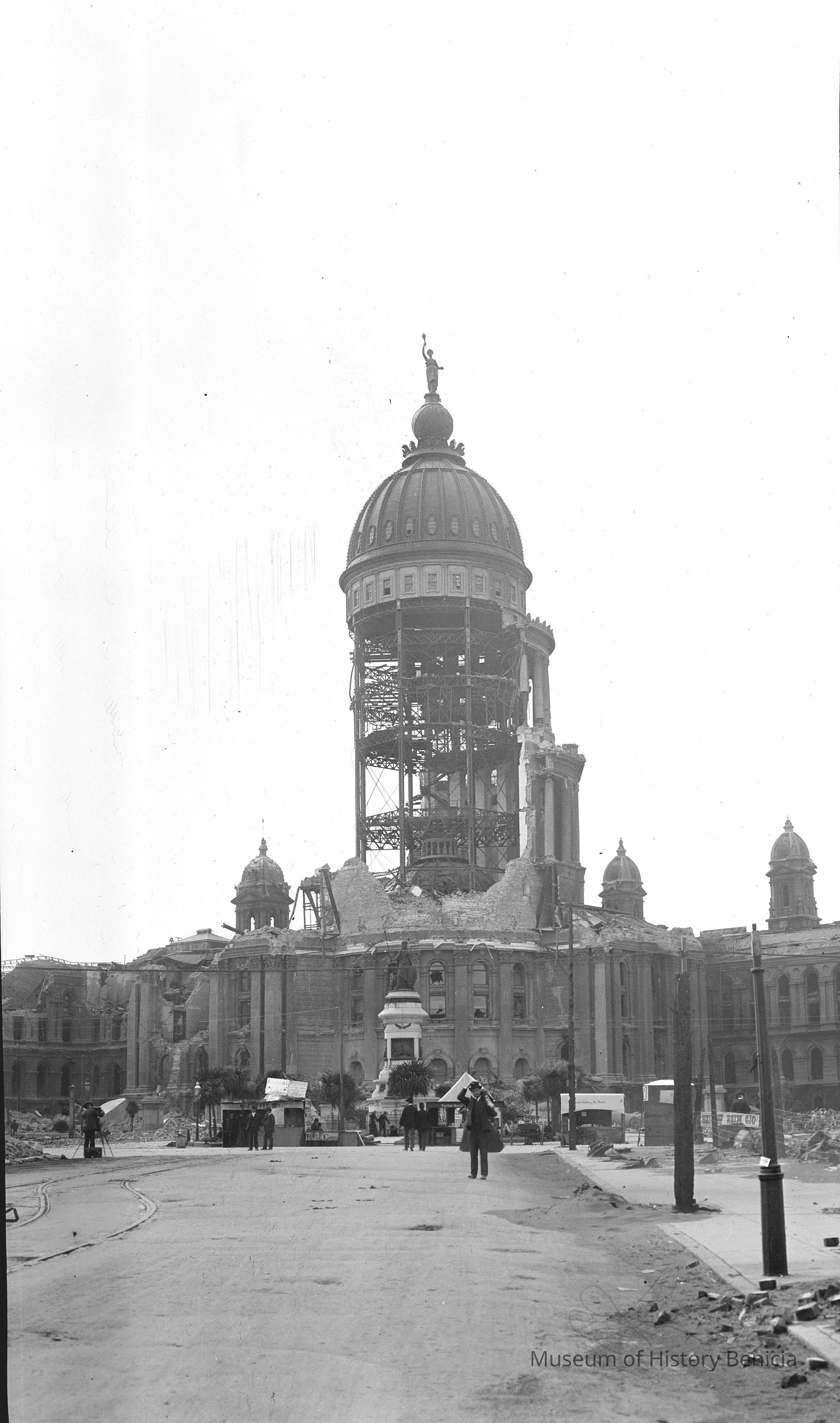 1906 SF Earthquake. City Hall from a distance. Workmen and tourists in front of building. Shows the coffee and souveiner stands set up in front of City Hall.Collection