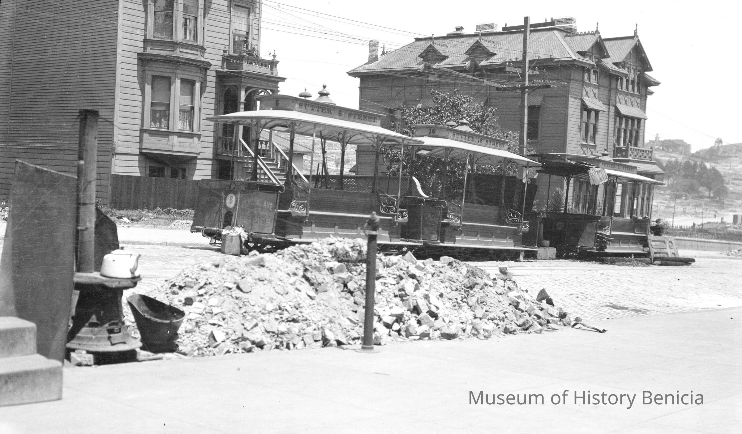 Street scene, San Francisco the earthquake in 1906. 1906 SF earthquake street scenes. Sutter Street streetcar in front of a house.