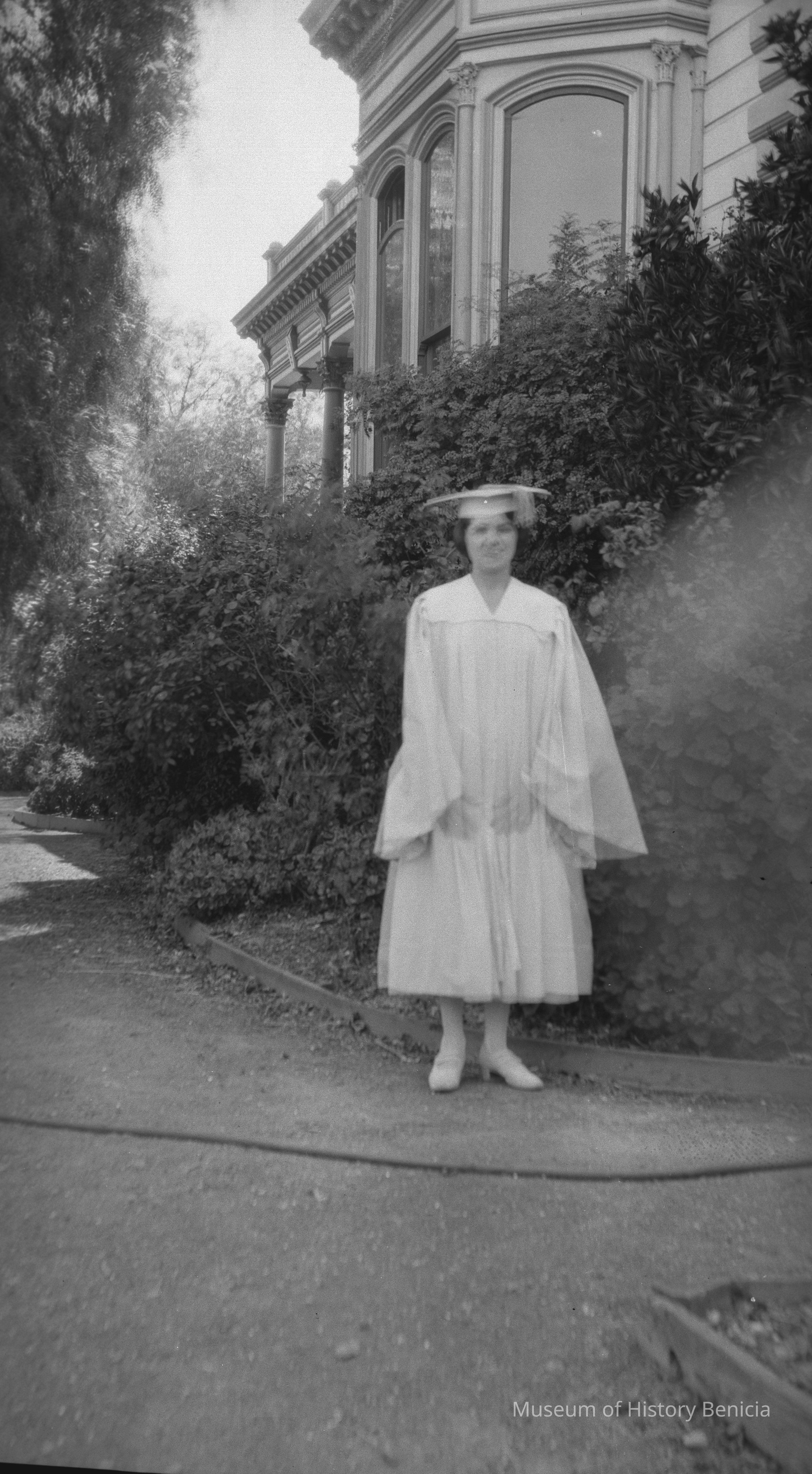 A girl in her graduation cap and gown. This is Margurite Molfino in front of the Hastings mansion.