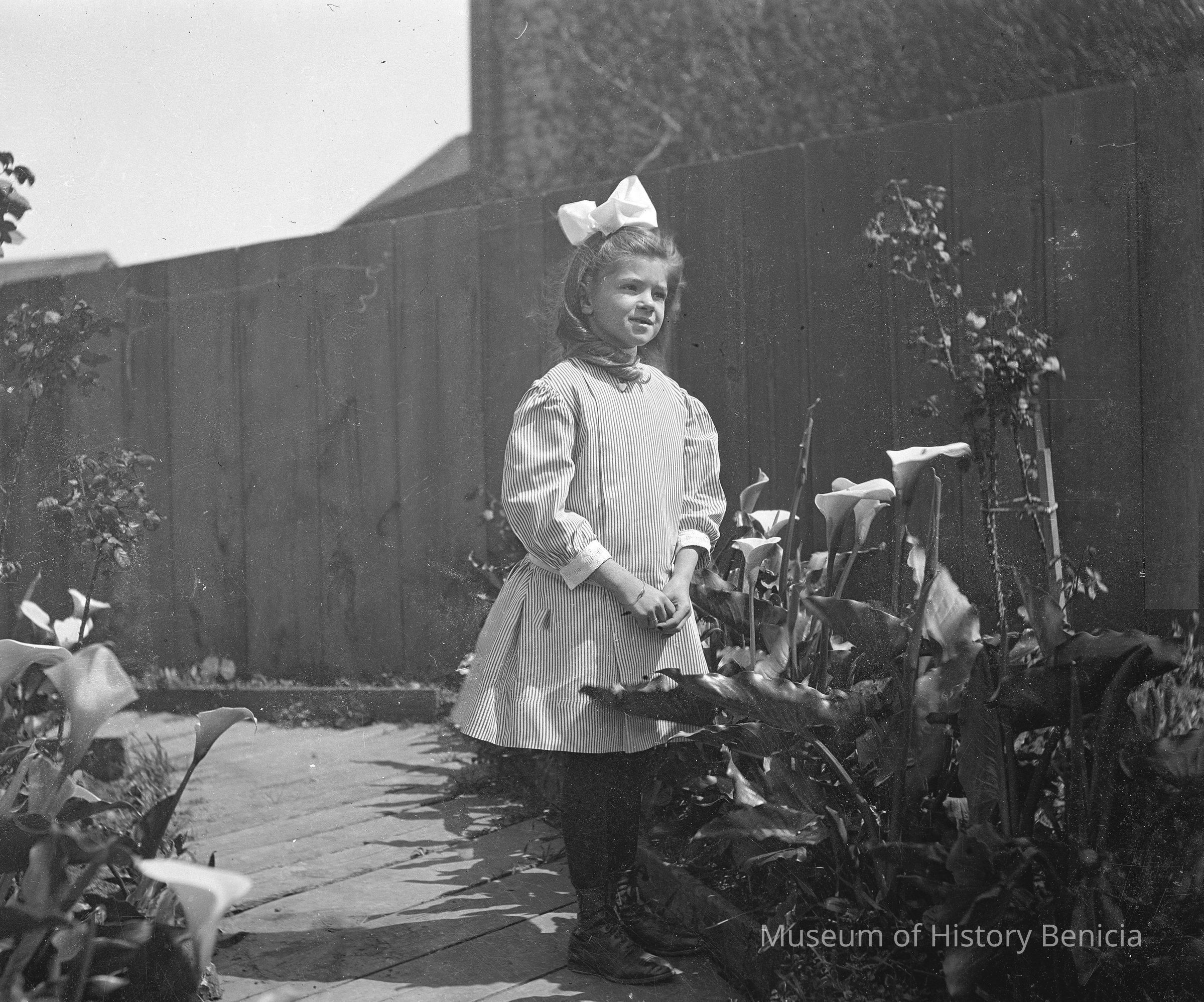 A young girl with a large bow in her hair standing behind lilies. This is Margurite Molfino.