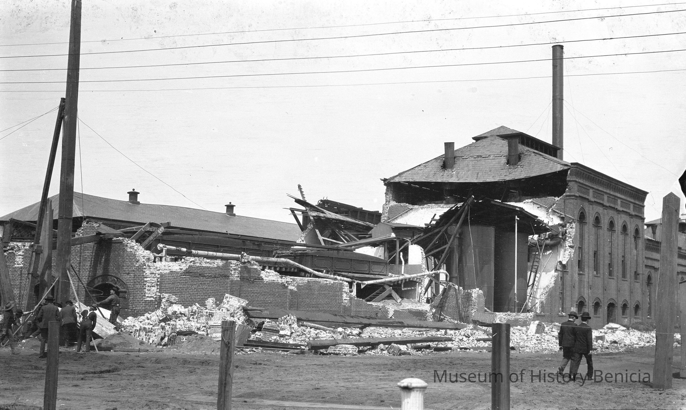 Gas Works, San Francisco. 1906 SF Earthquake Gas Works. Wall of building collapsed and guys are trying to prop up a post.