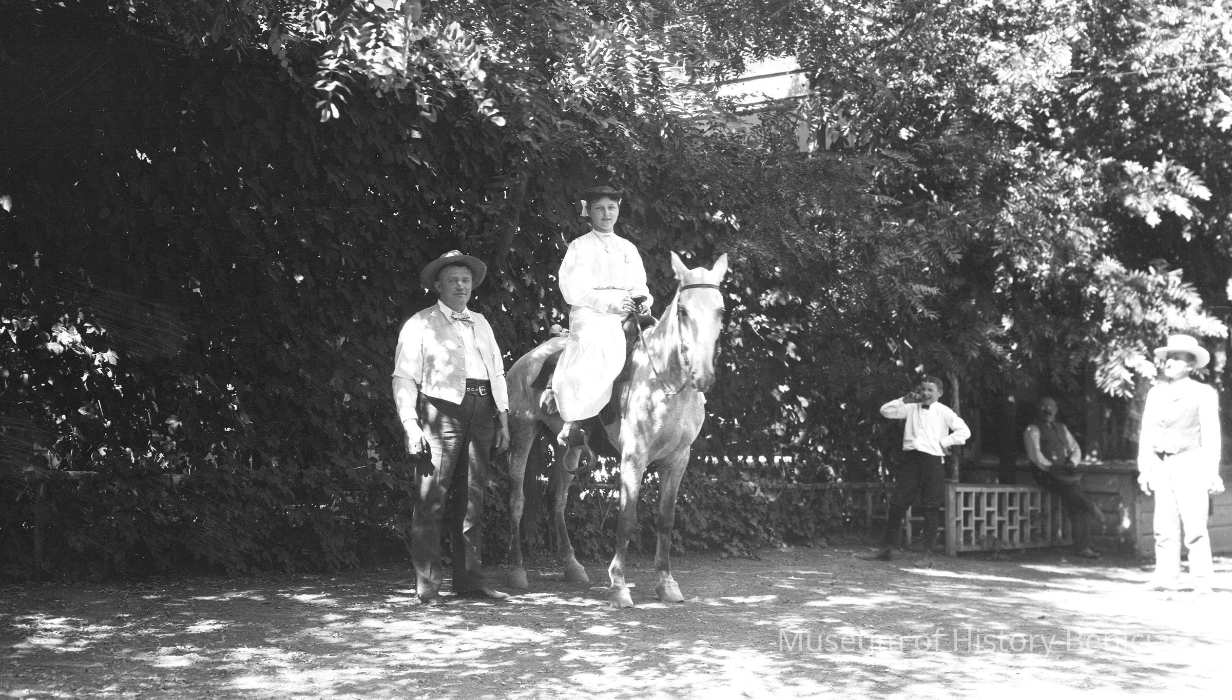 Saratoga vacation. Girl sitting (same girl as in 23004.001.0959) on a horse with men standing around.