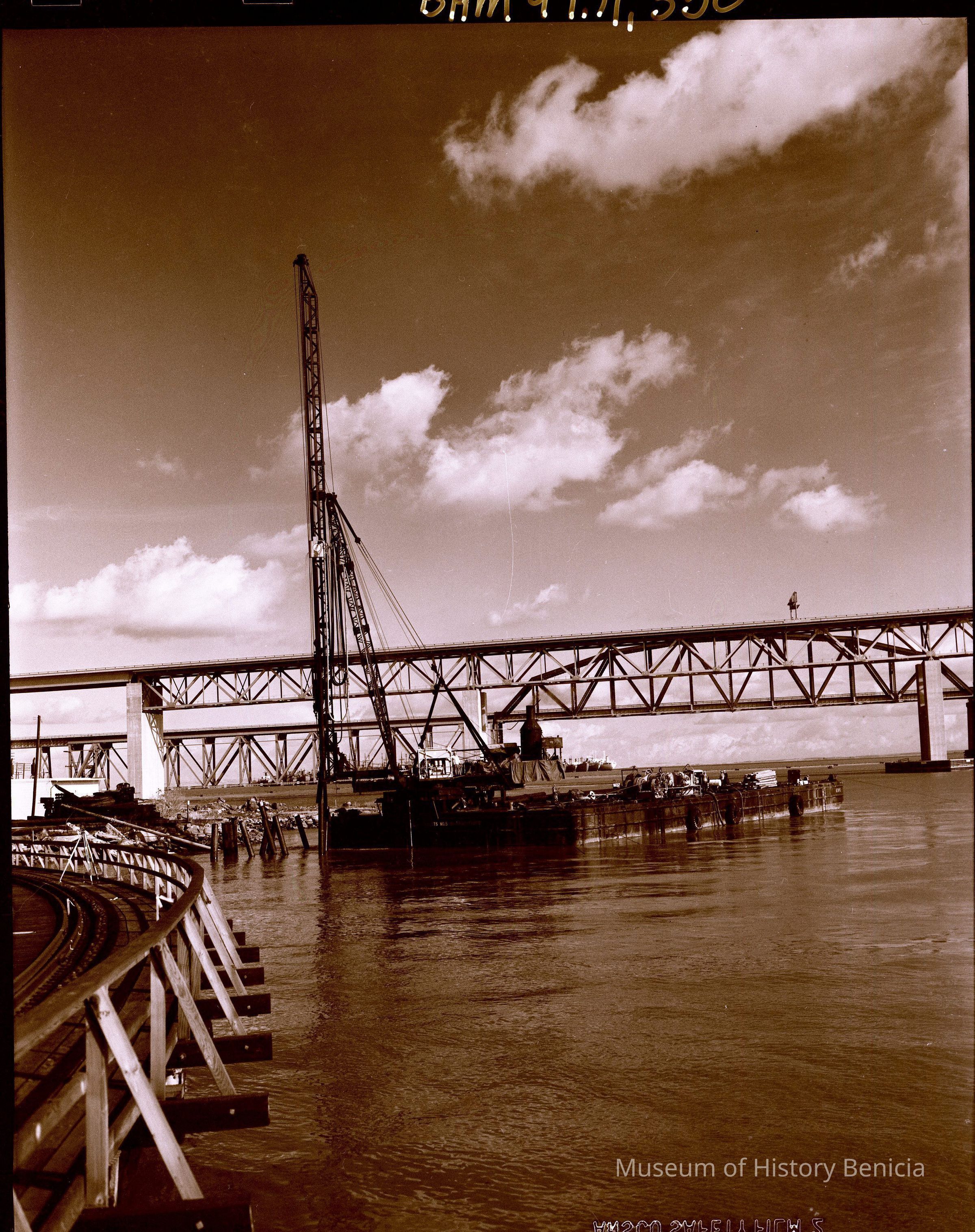 B/W negative of drilling/pile driving equipment on a barge on Carquinez Strait shoreline south of Benicia/Martinez Bridge (in background)