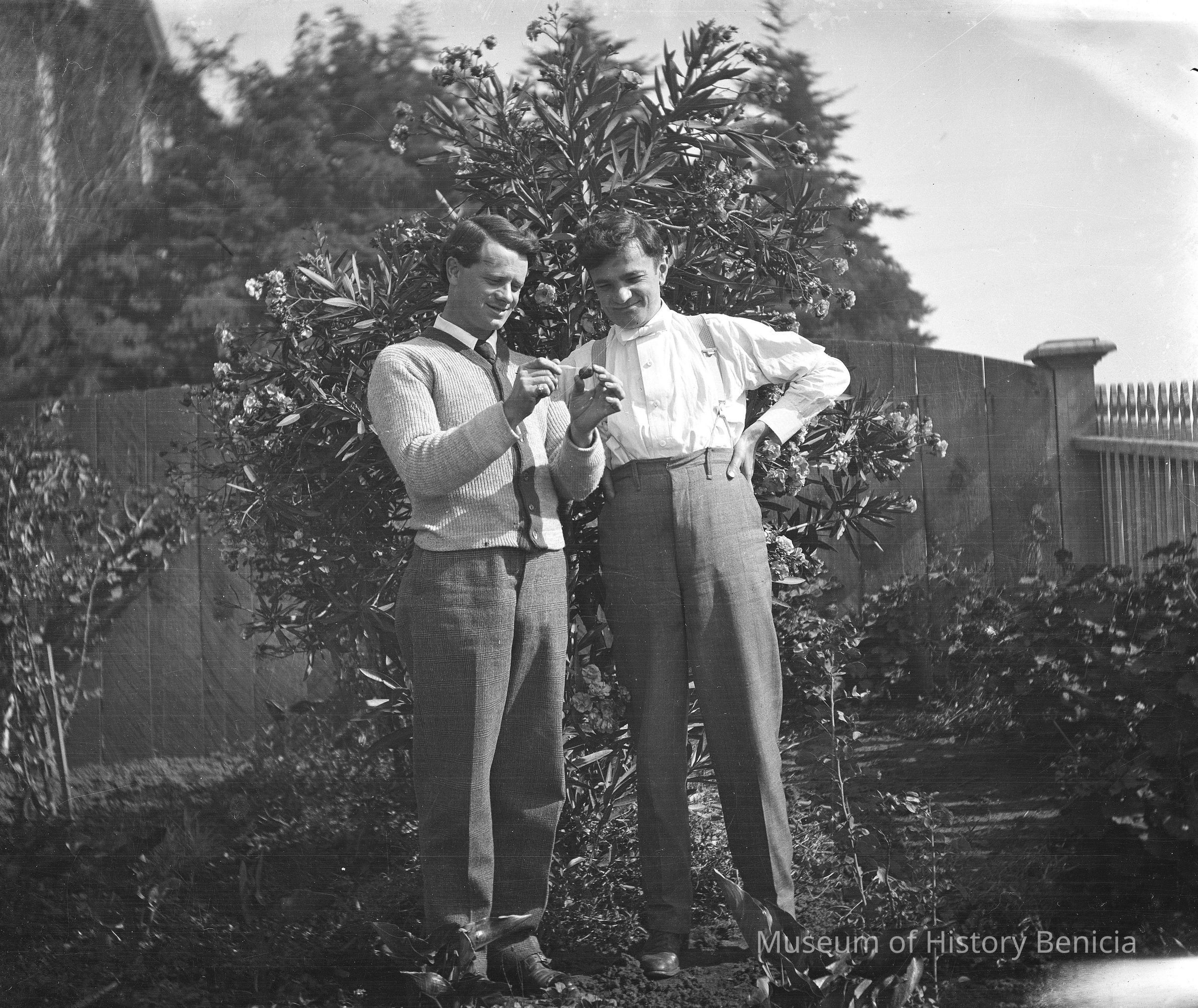 Two men standing in front of a bush. The man on the right is John Molfino. The other man is examining something.