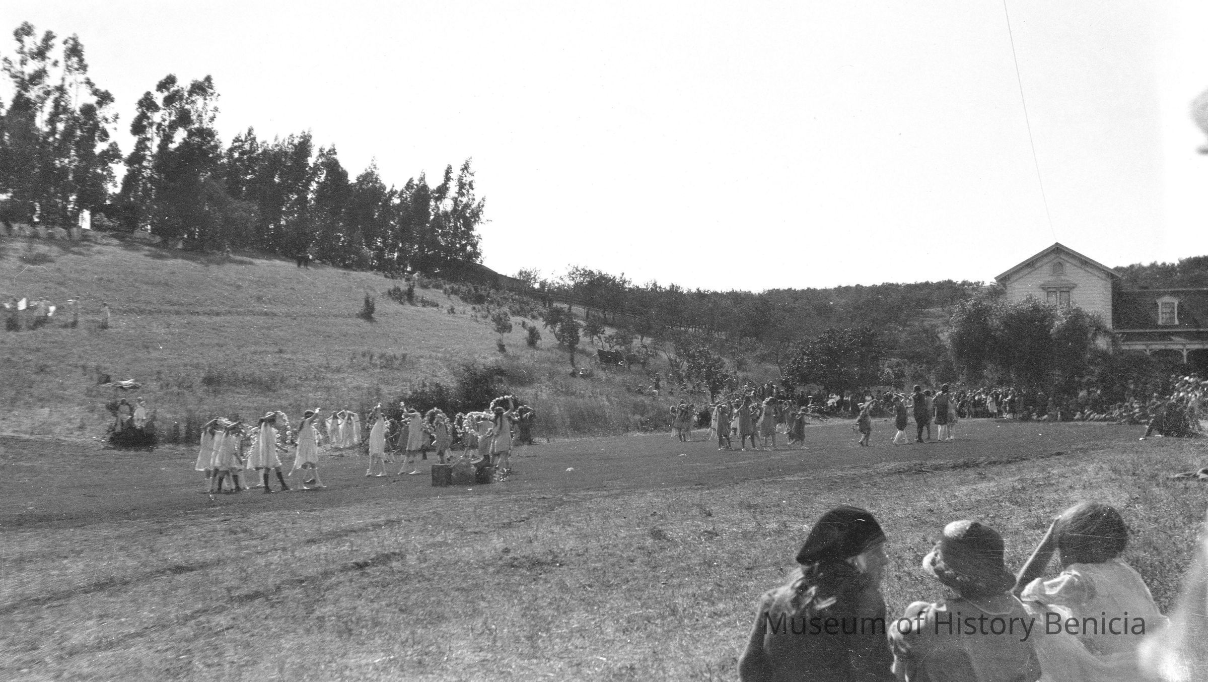 Groups of people scattered around an open area. People in costume in a field next to a farmhouse with crowds watching. Probably the Solano History Pageant of 1923 at Alma Pometta ranch.Collection
