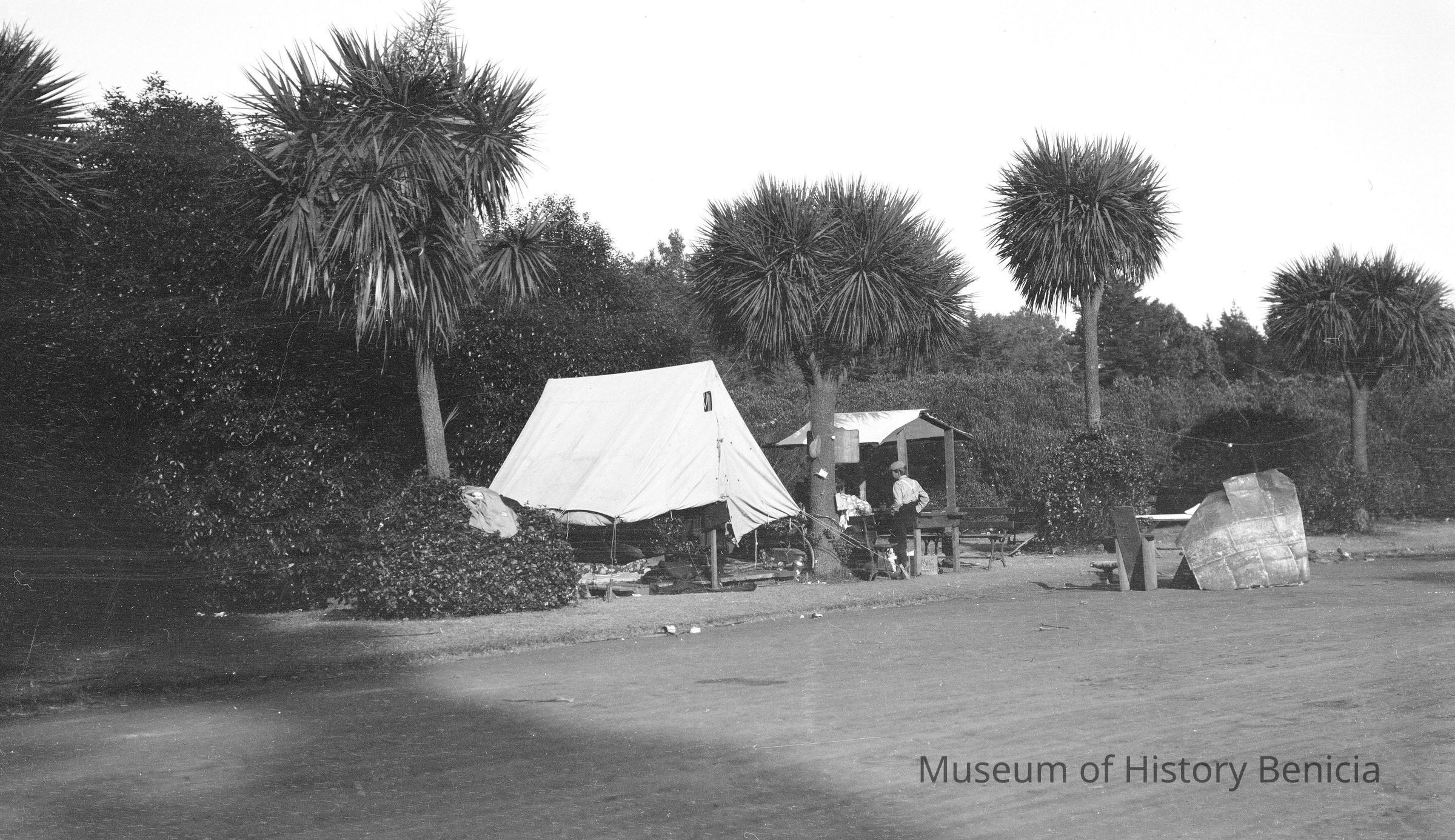 Refugee camp, San Francisco. 1906 SF earthquake refugee camps. A tent next to a table and benches with a man and woman standing outside.