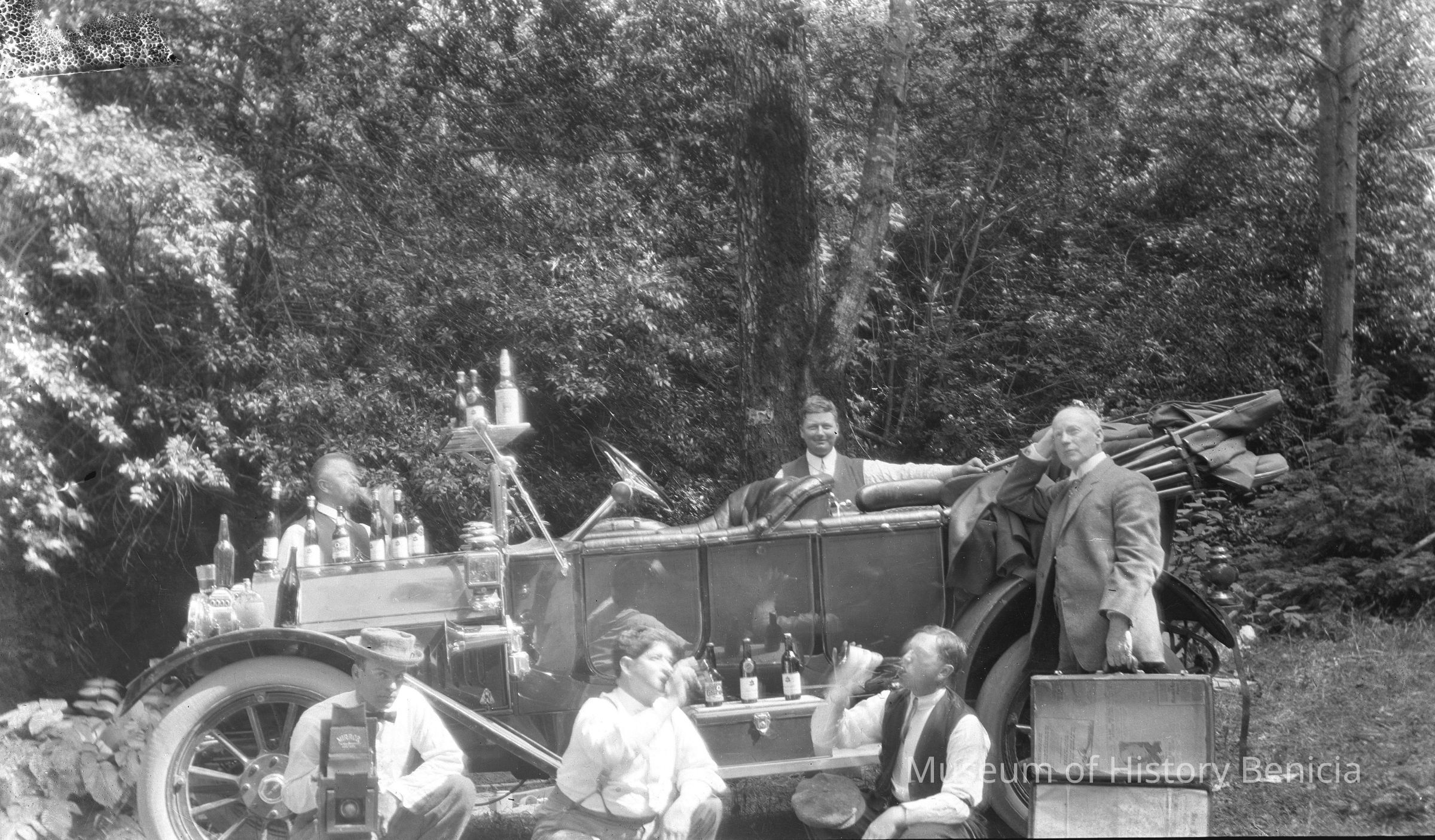 Six men in a wooded area sitting in and leaning on a car. There are bottles everywhere. The man standing on the far right is Mayor Crooks. He has an open suitcase in his hand that is lined with newspapers.