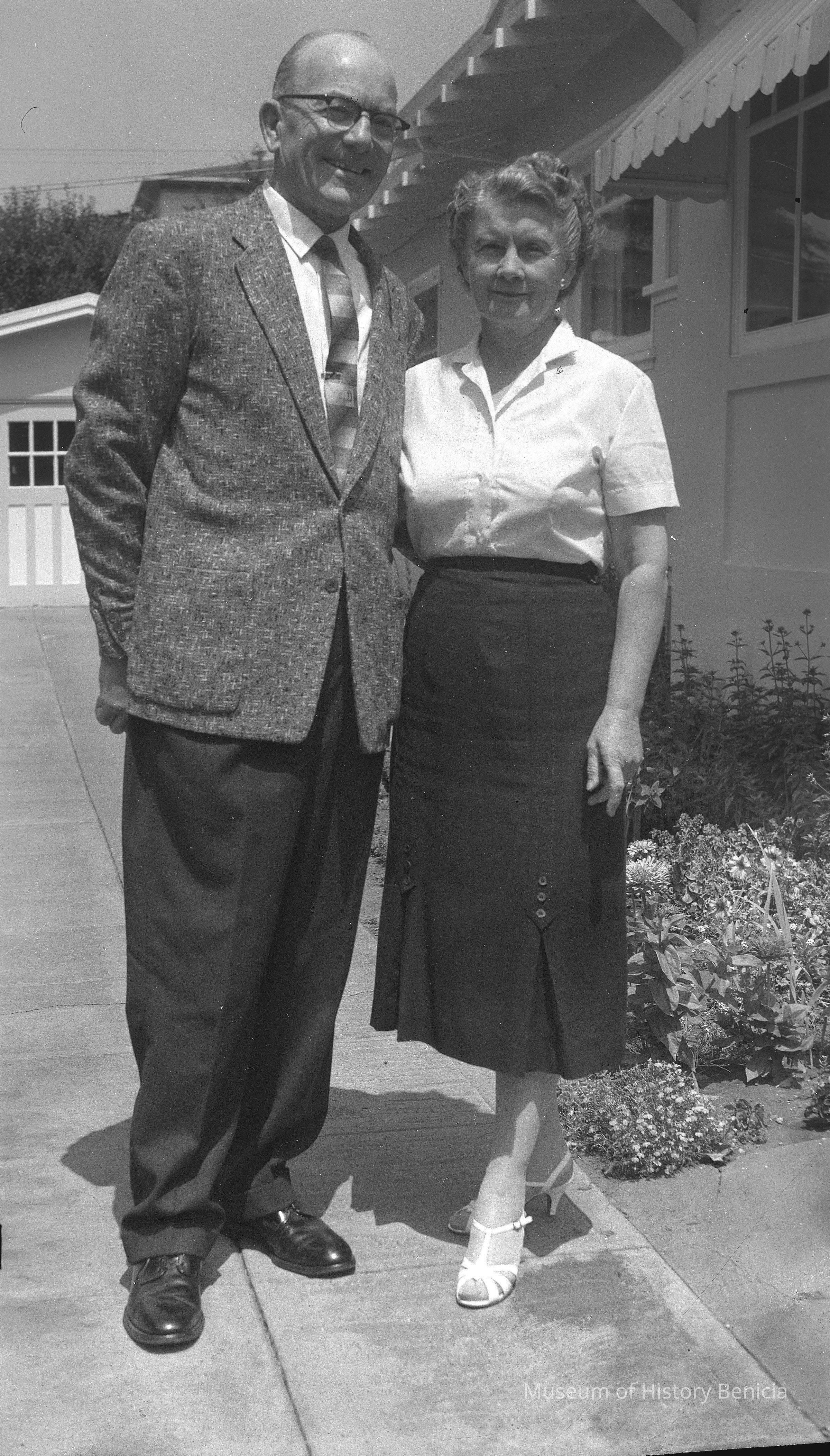 A man and woman standing in the front yard of a house.