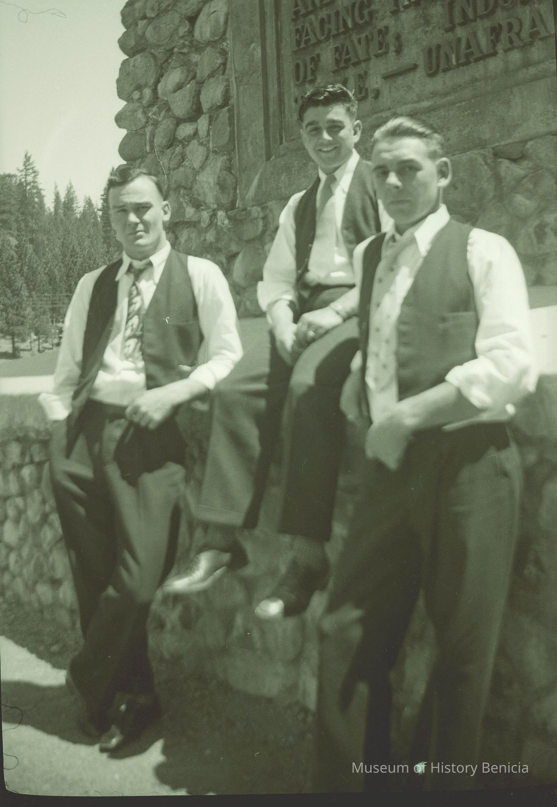 B/W negative of three young men at Donner Pass near Tahoe.
