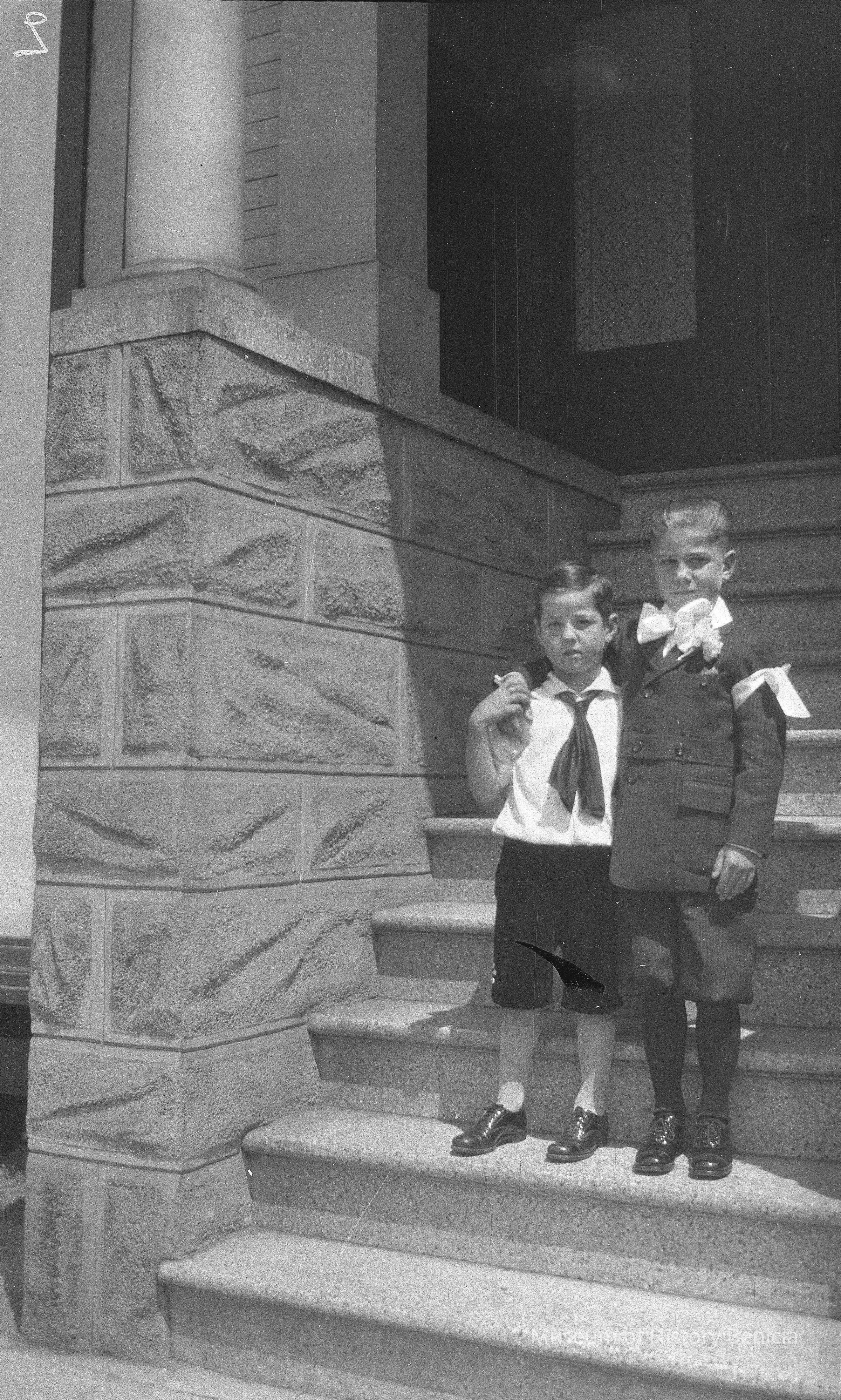 Two boys standing on the front steps of an apartment building. * envelope labeled "Clement St. apartment"