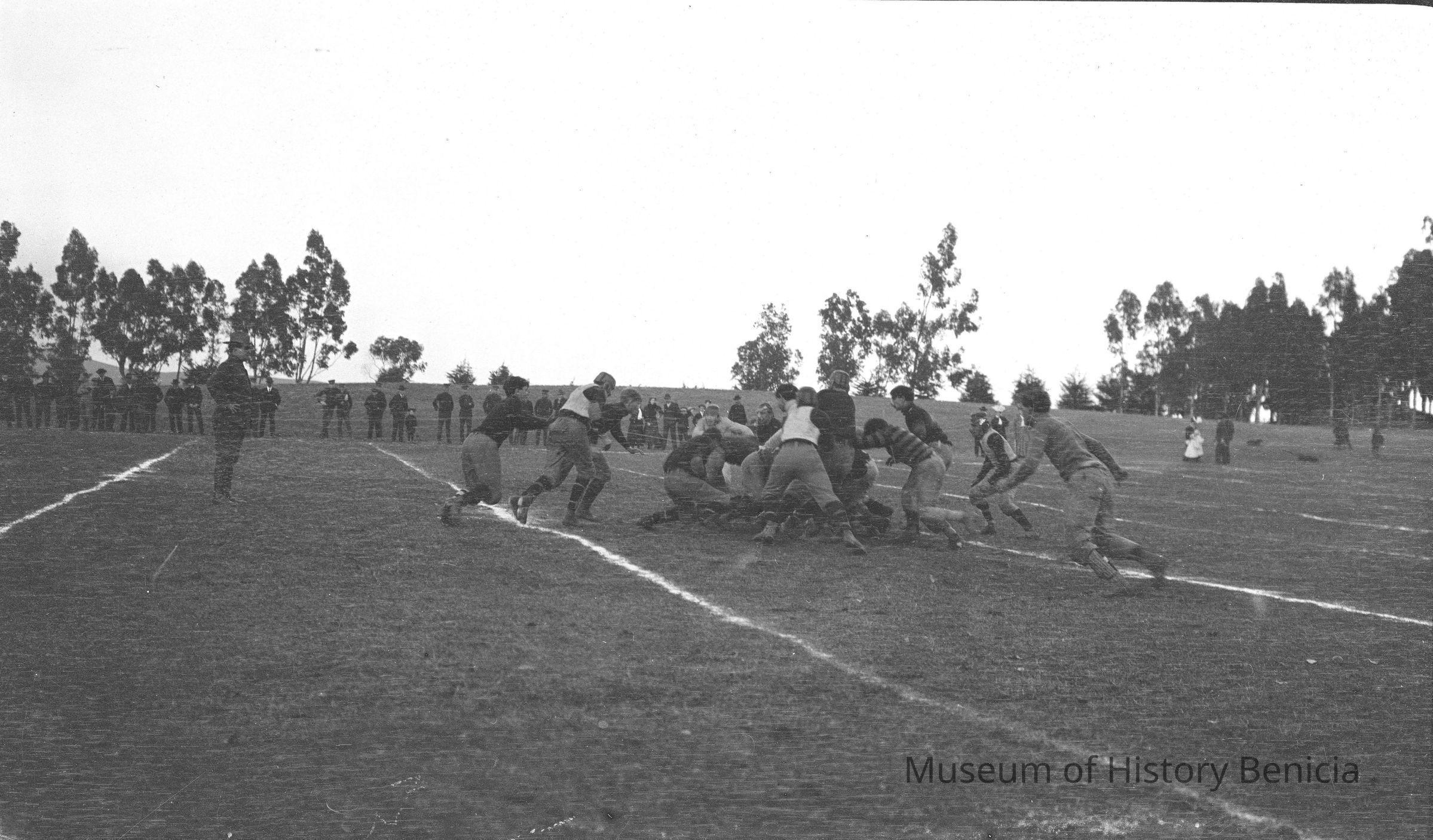 A football game. Football game Benicia Town Boys vs. Arsenal Signal Corps Thanksgiving 1905 or New Years 1906 in progress. On Fitzgerald field.Collection