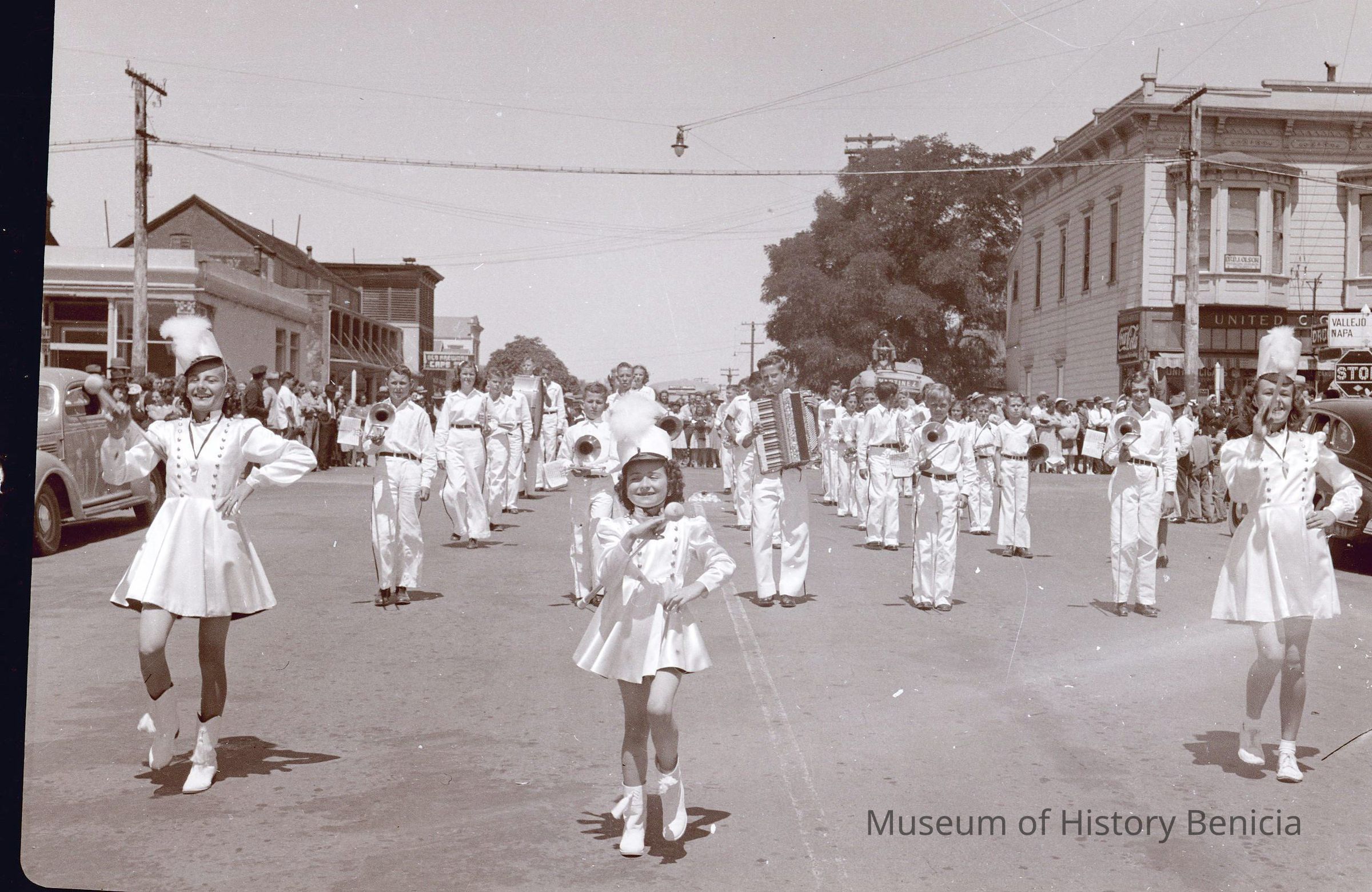 B/W negative of a marching band. Looks like maybe the high school band. In the background is a Martinez bus with the driver sitting on top.