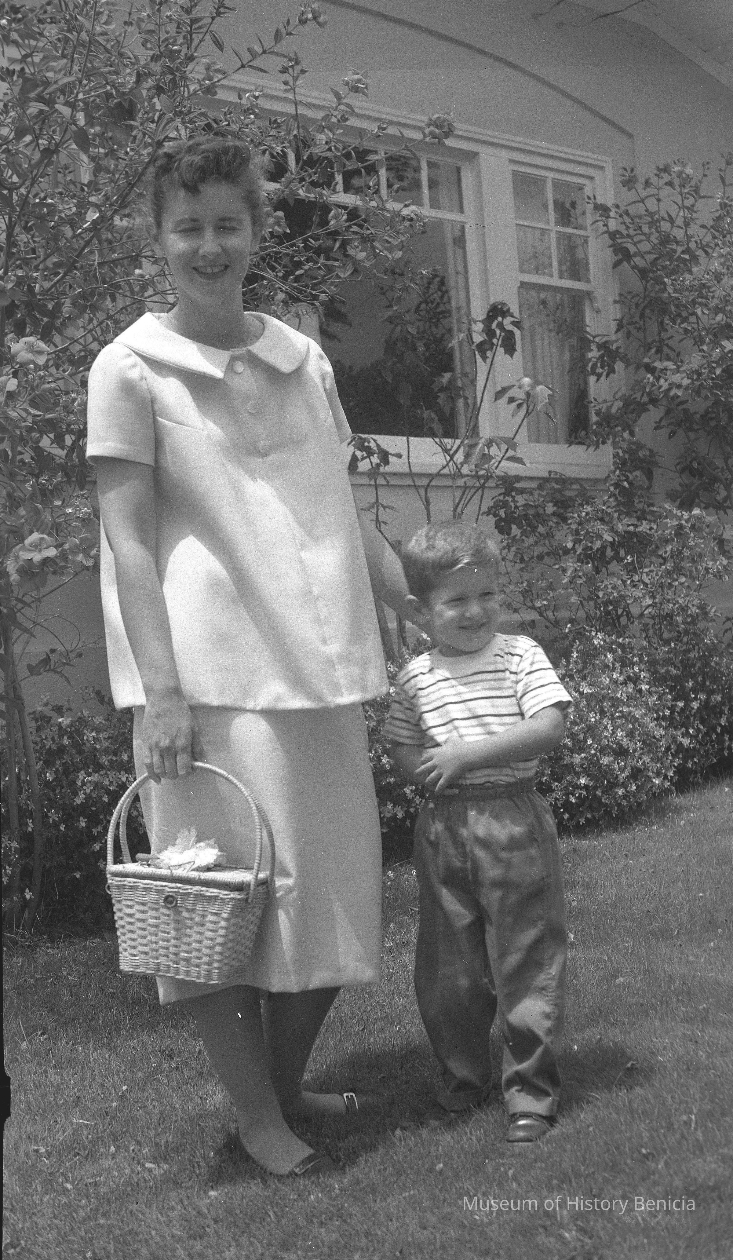 A woman and small boy standing in front of a house.