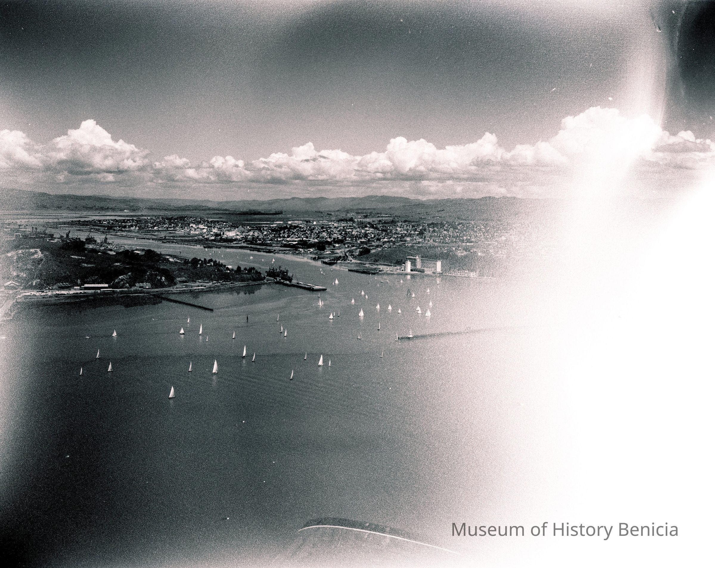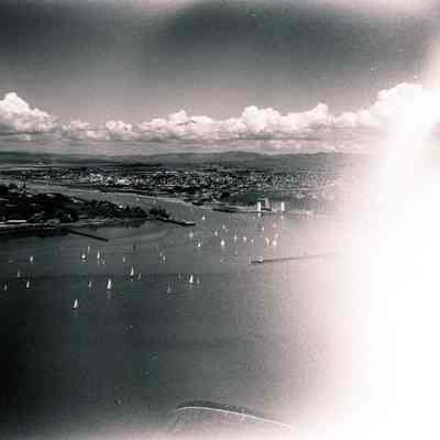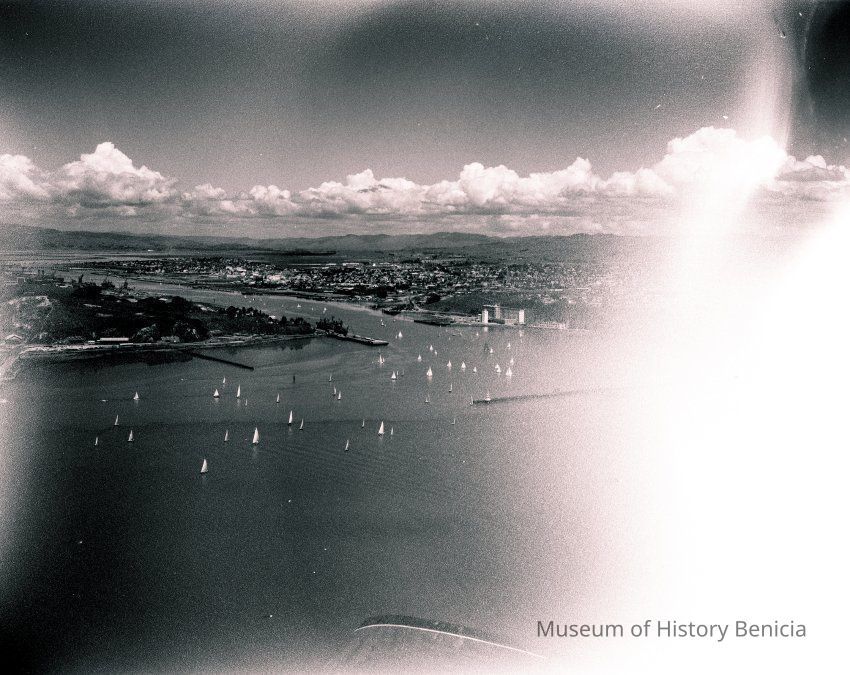 B/W negative, envelope identified as "Annual Sail Regatta, Vallejo"; left side of negative is blurred; right side shows small sail boats, and a tanker-type ship at confluence of Napa River and Carquinez Strait.