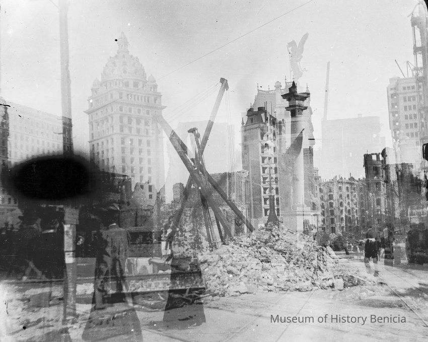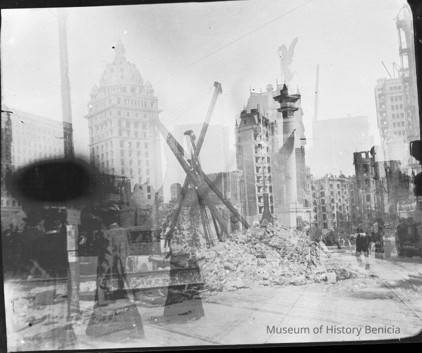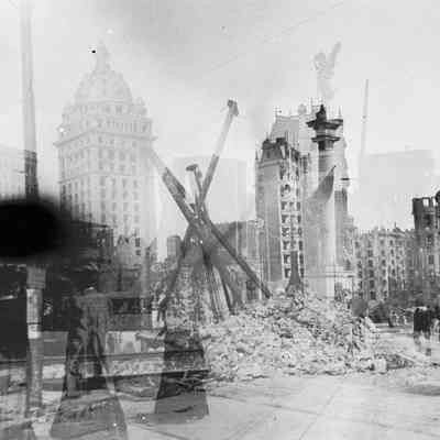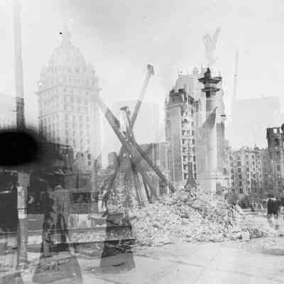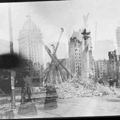 This photo is one of a series of photos of San Francisco after the 1906 earthquake. This photo shows two photos in a double exposure. One photo is of the Call building with rubble and two crossed beams in front and the other is of the Native Sons of the Golden West monument at Mason and Turk. (see record 2004.001.1072 for a similar photo of the Call building.)Collection