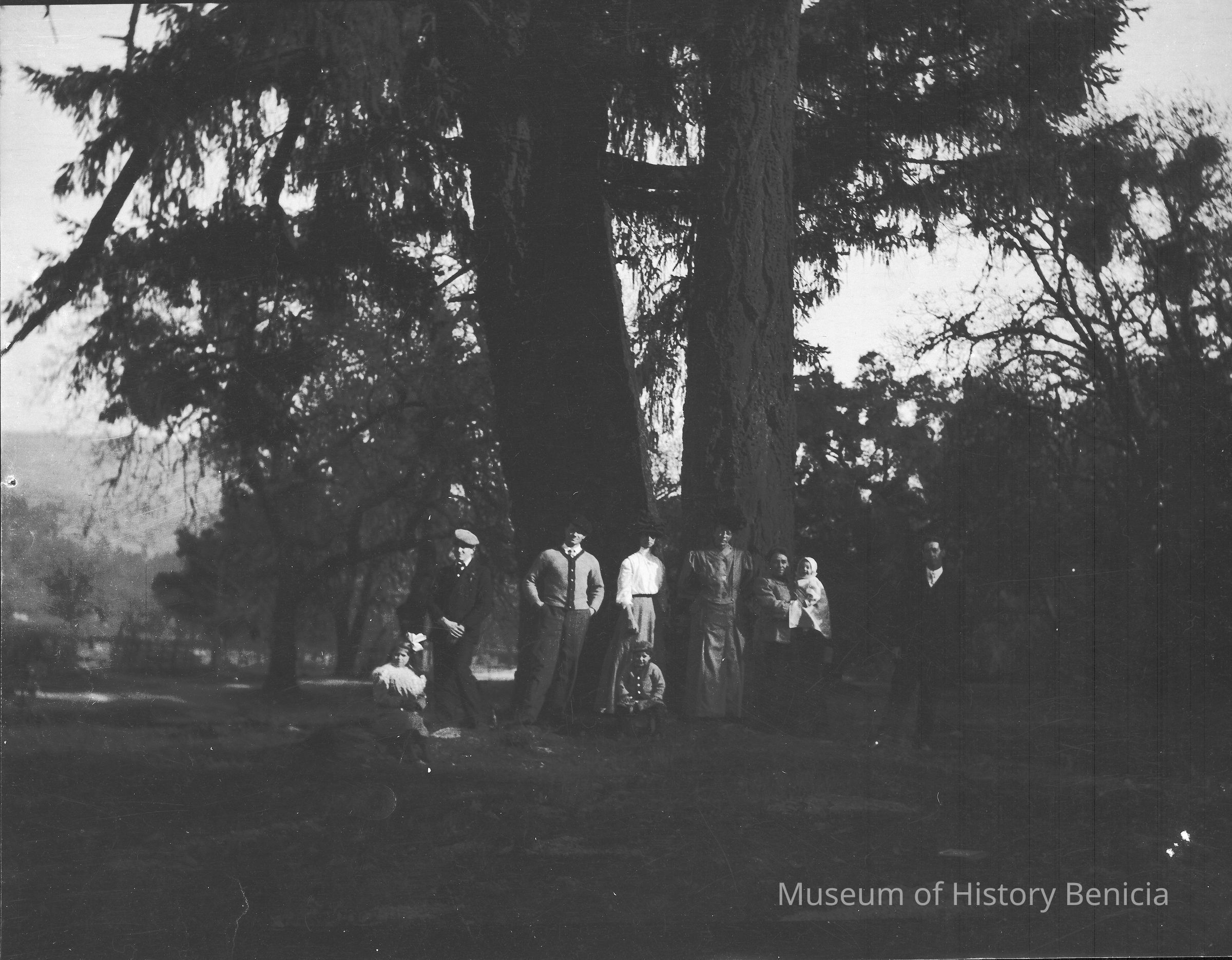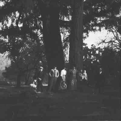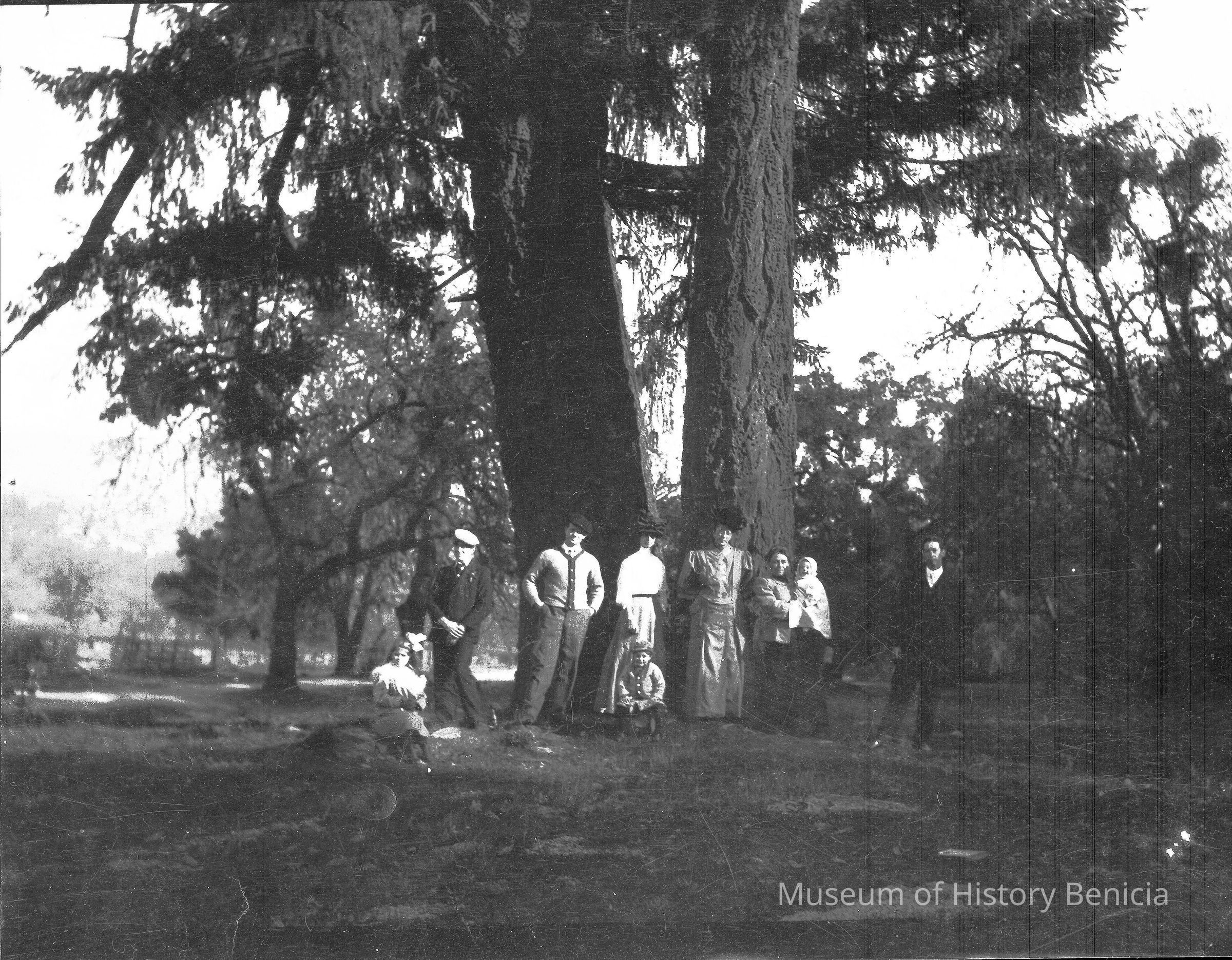 This negative shows a group of people in the woods. The second man from the left looks like John Molfino. The girl on the rock is Margurite Molfino, his daughter. The woman on the far right holding a child is Dita Molfino and her daughter Violet. Not sure who the others are in the photo.Collection
