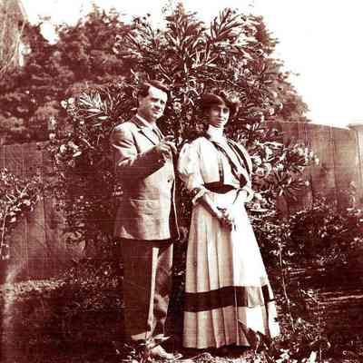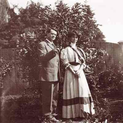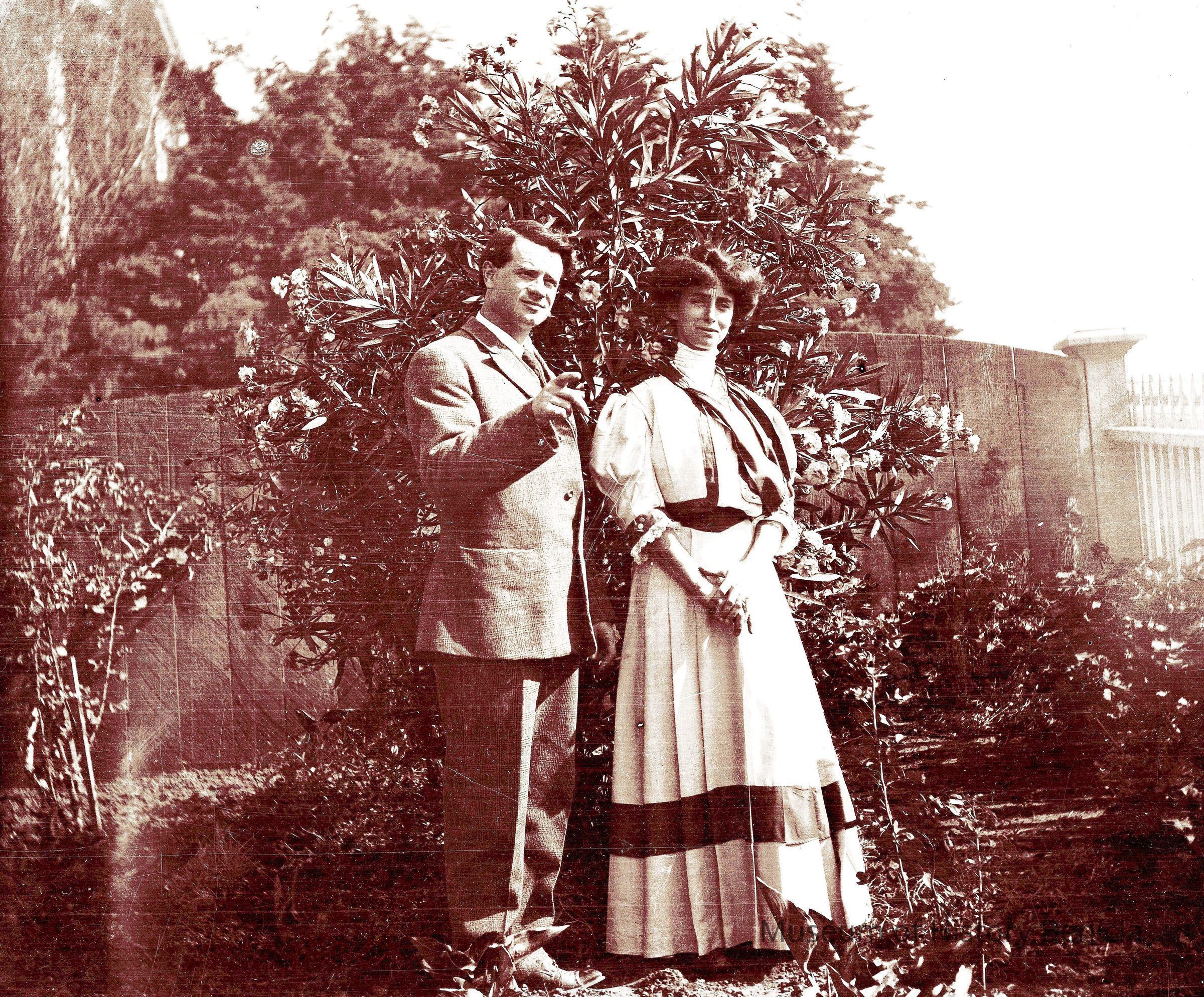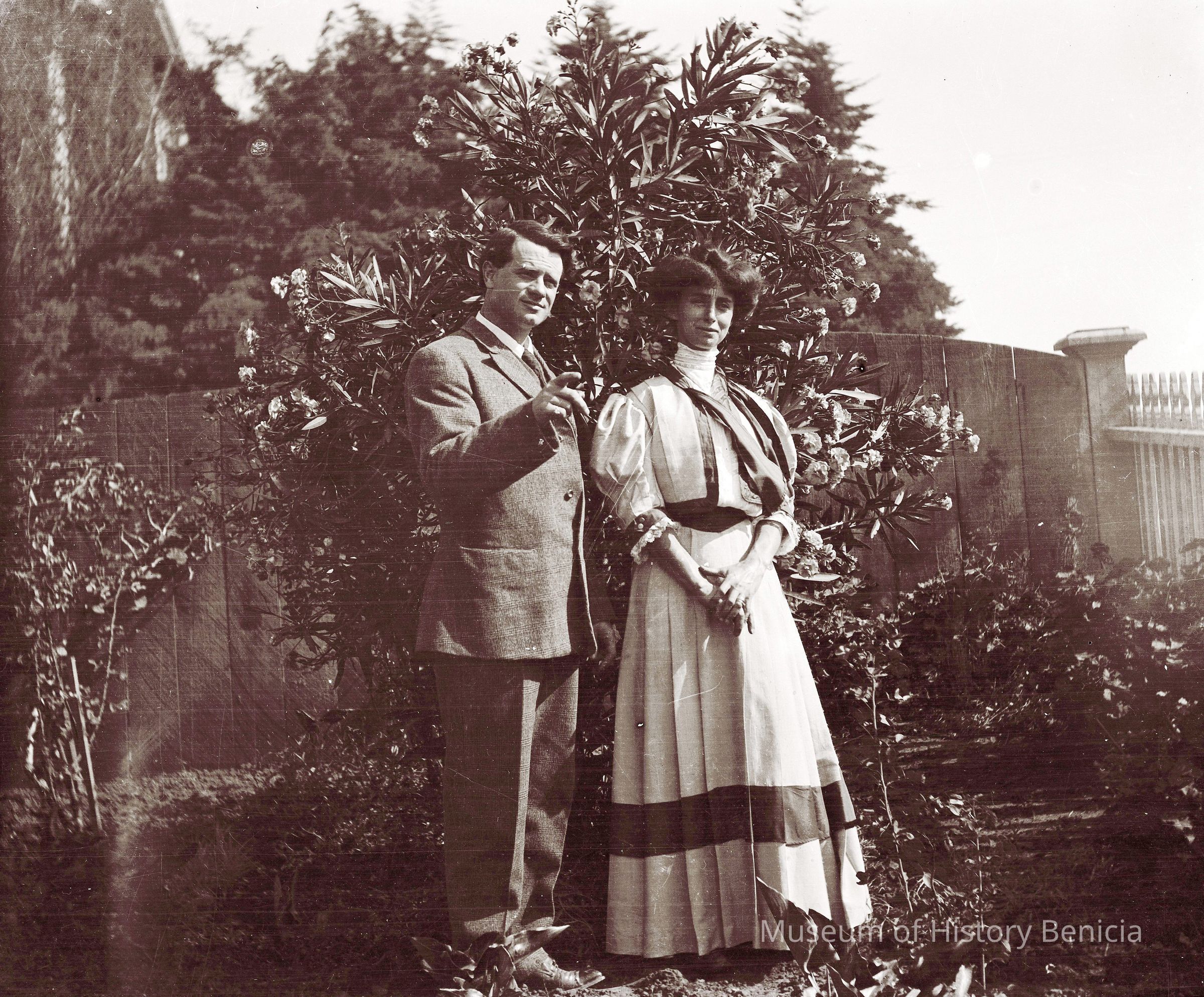 This negative shows John Molfino and a woman in the garden.