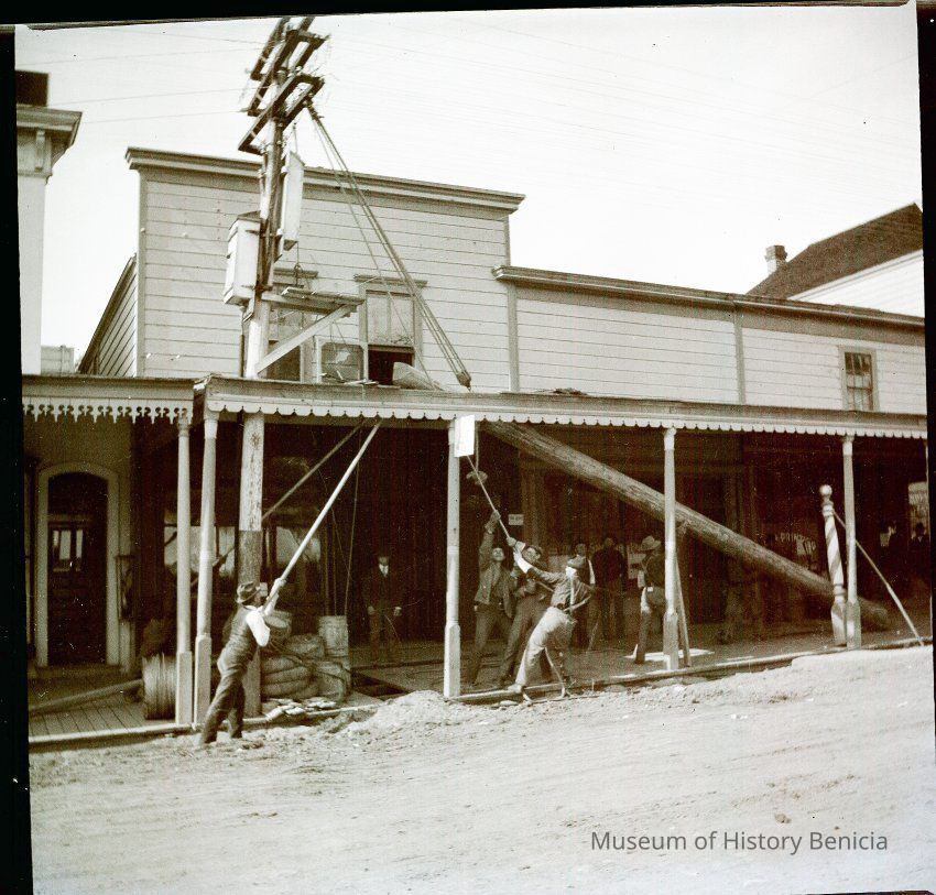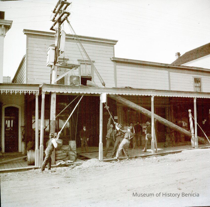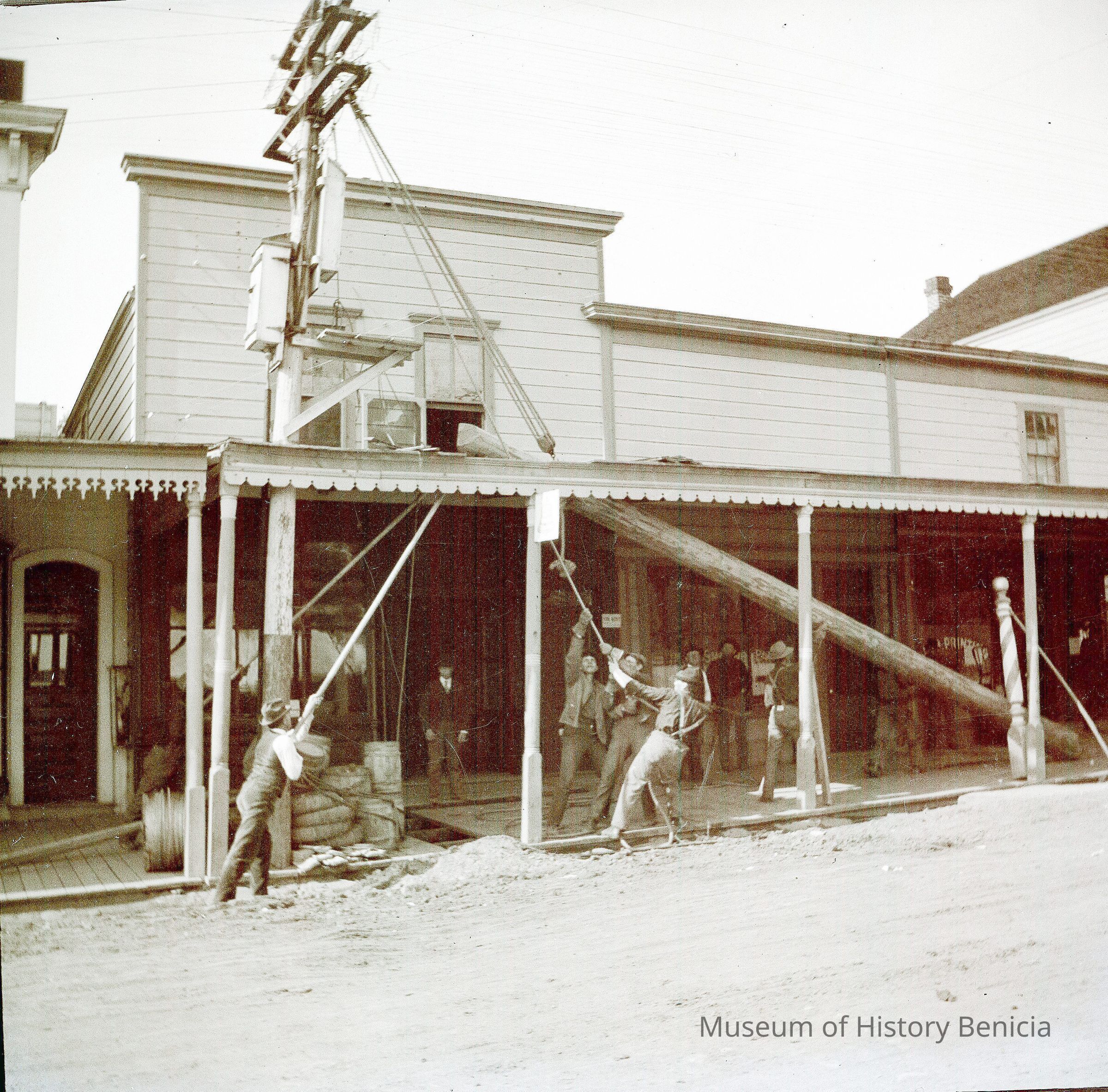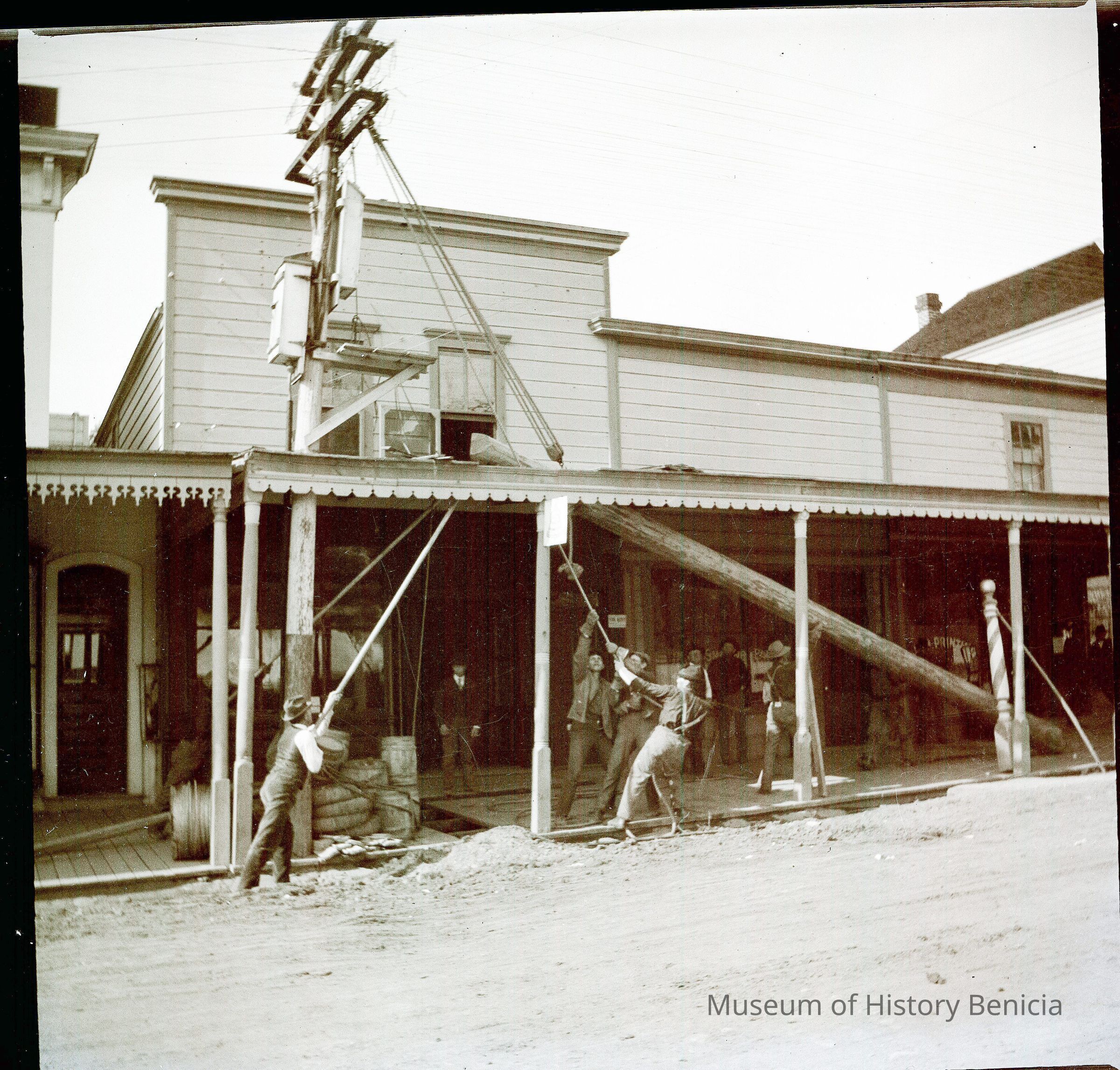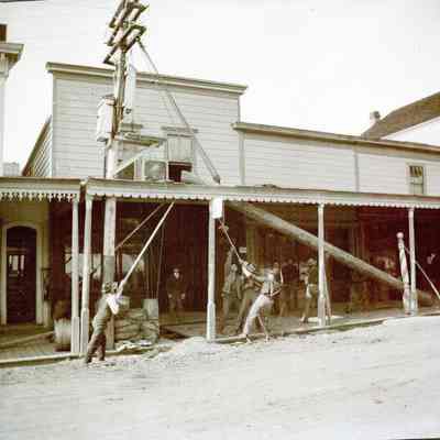 This negative shows men raising a telephone / telegraph pole in downtown. There is a barbershop nextdoor that says "Shaving Parlor" in the window. The other window seems to be a printing shop.Collection