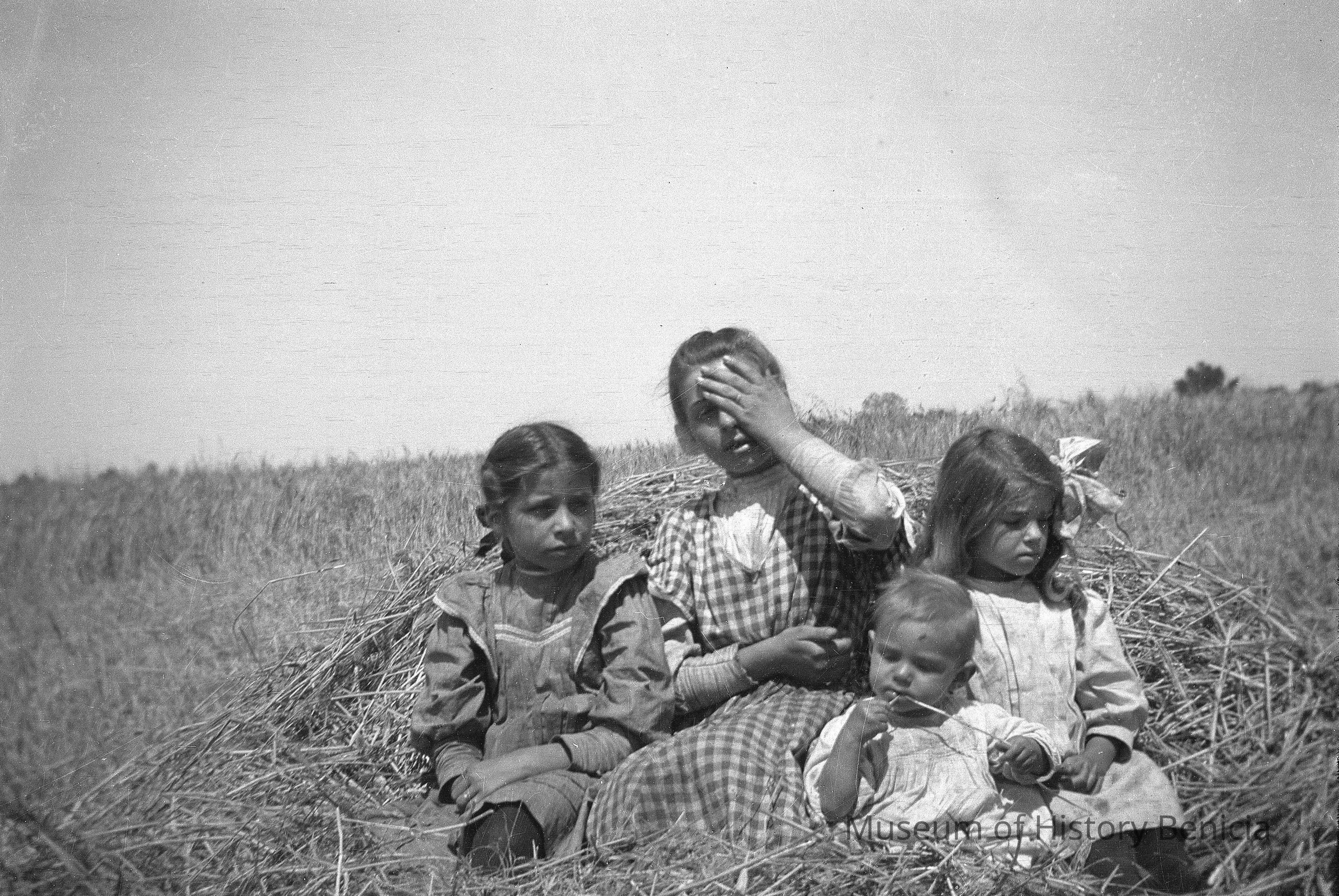 Four children sitting in a field. The girl on the right is Margurite Molfino.