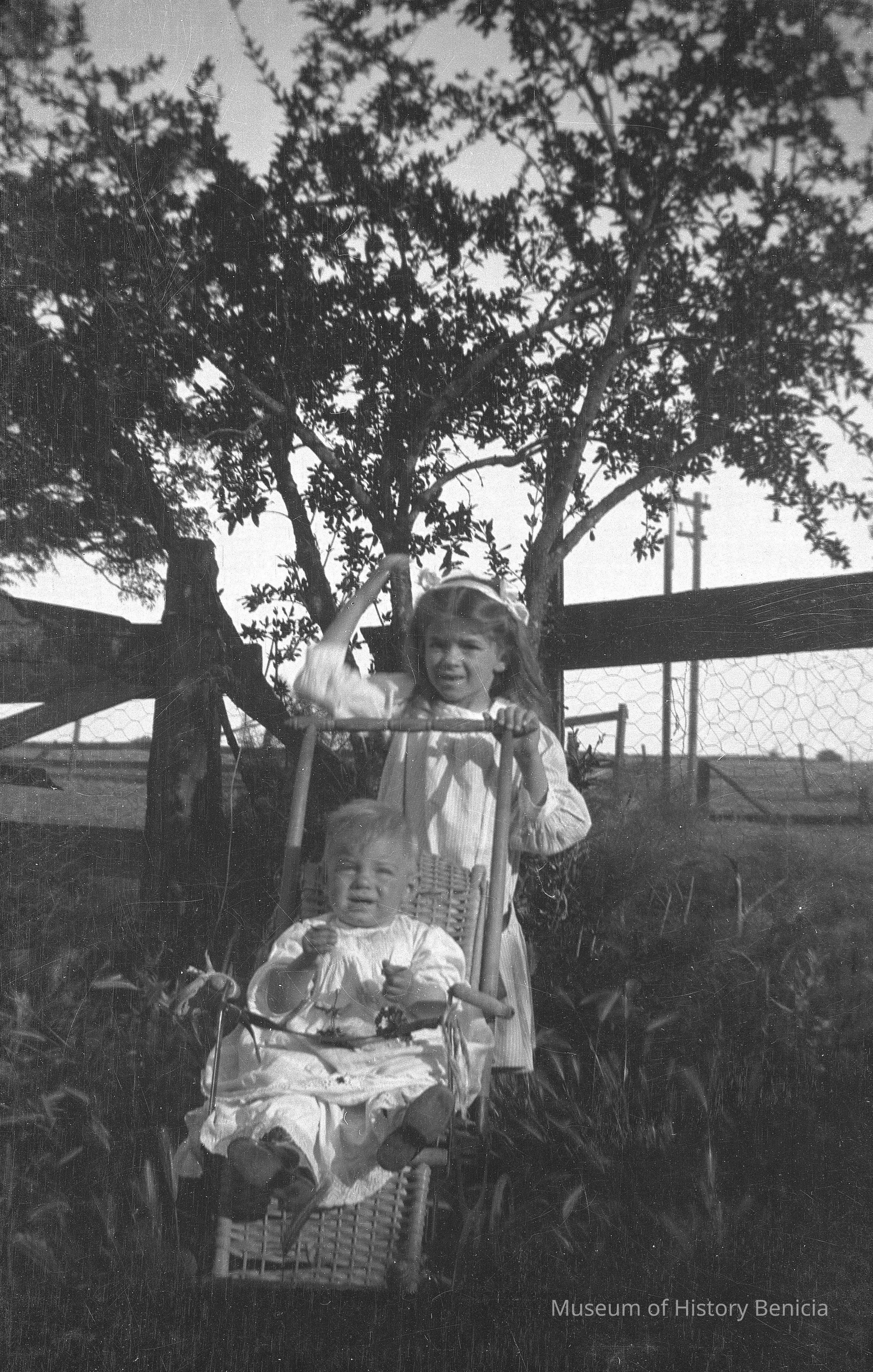 A girl pushing a baby stroller in a field. The girl pushing looks like Margurite Molfino and the baby is probably Violet Molfino.
