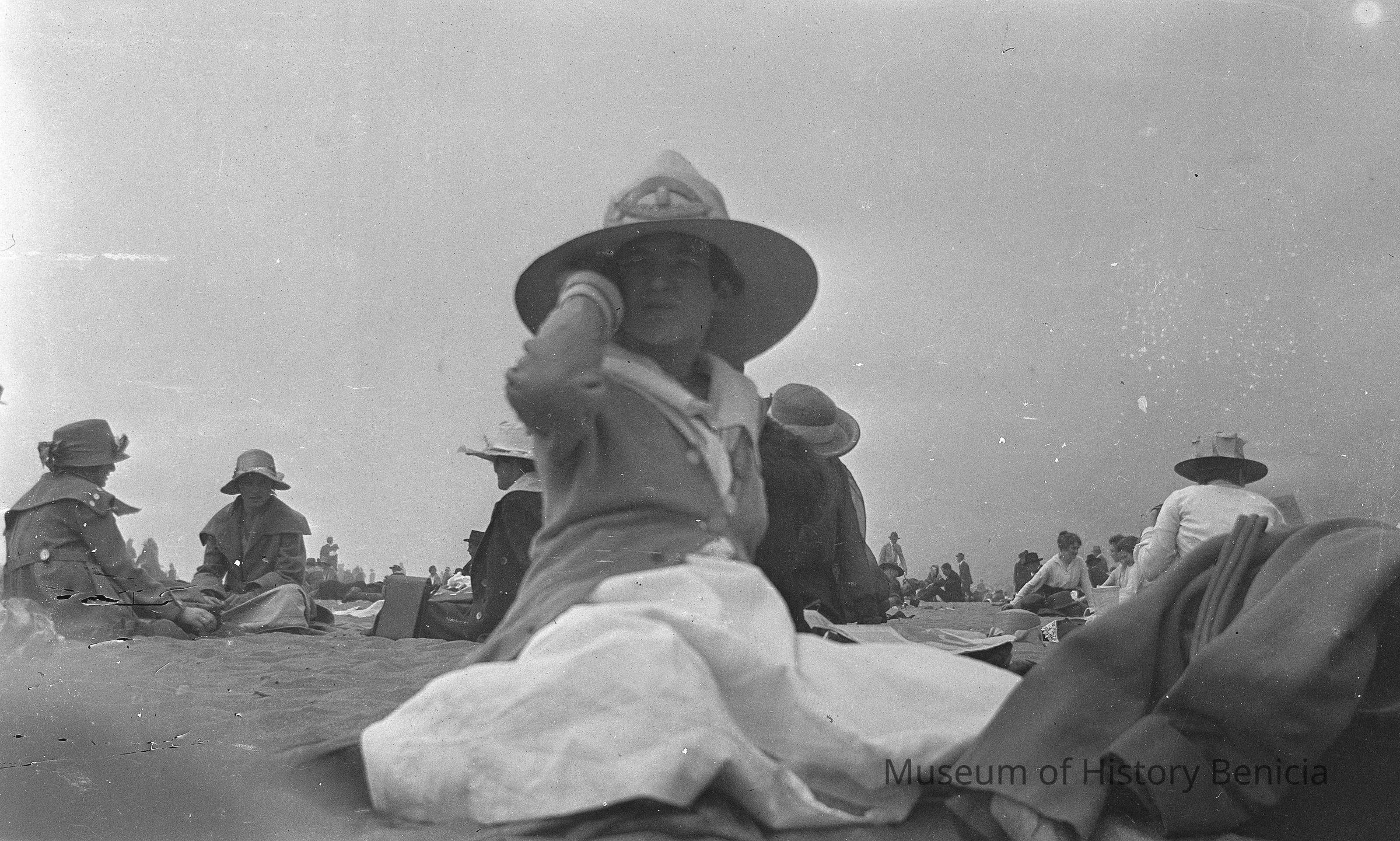 Ocean Beach, San Francisco. A woman wearing a widebrimmed hat in the foreground.