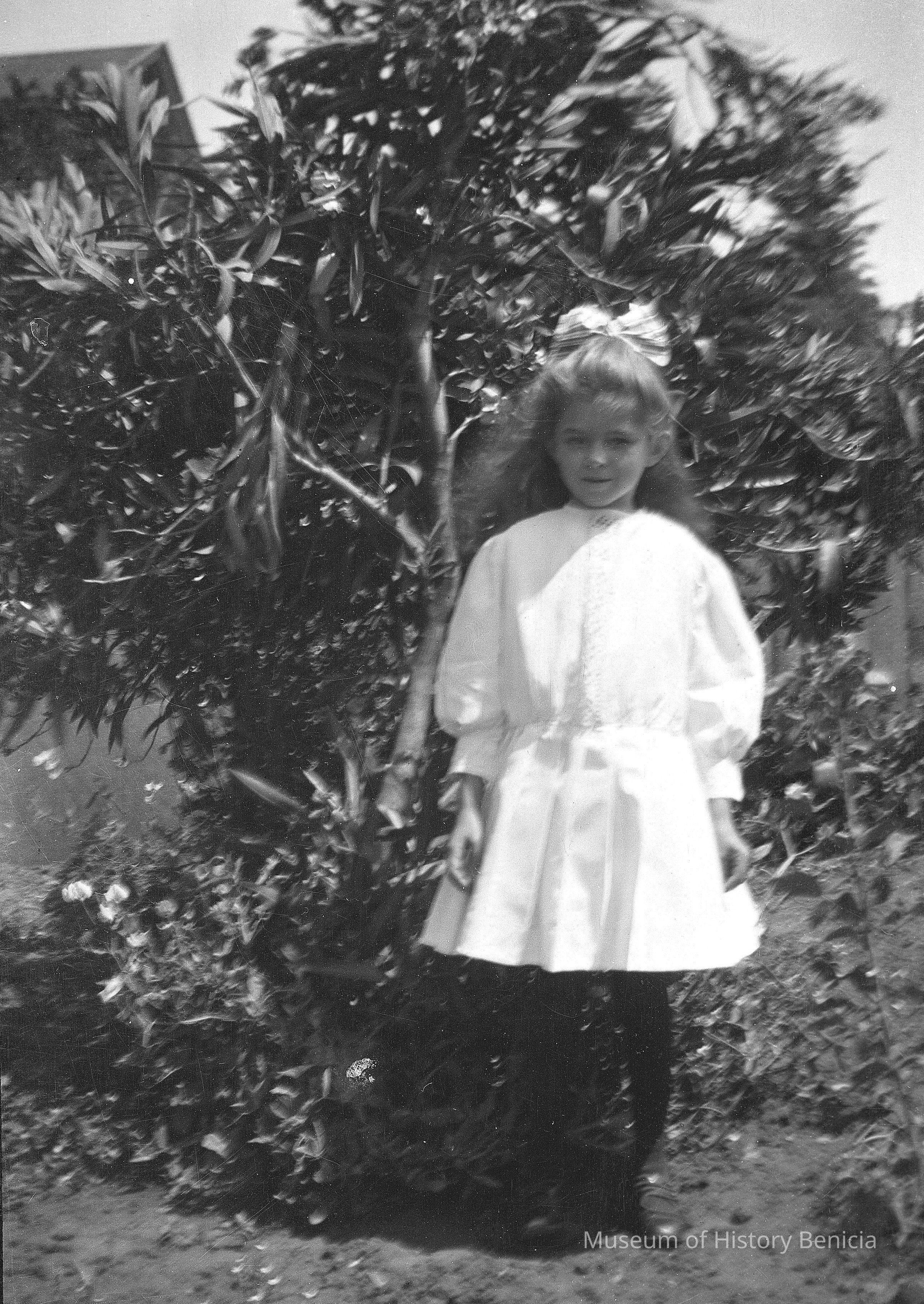 A young girl standing in front of a tall bush. Marguerite Molfino by bush